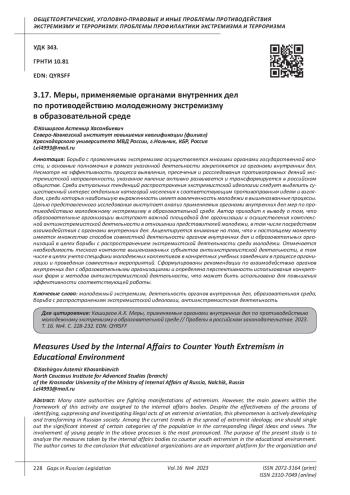 Борьба с проявлениями экстремизма осуществляется многими органами государственной власти, и основные полномочия в рамках указанной деятельности закрепляются за органами внутренних дел. Несмотря на эффективность процесса выявления, пресечения и расследования противоправных деяний экстремистской направленности, указанное явление активно развивается и трансформируется в российском обществе. Среди актуальных тенденций распространения экстремистской идеологии следует выделить существенный интерес отдельных категорий населения к соответствующим противоправным идеям и взглядам, среди которых наибольшую выраженность имеет вовлеченность молодежи в вышеназванные процессы. Целью представленного исследования выступает анализ применяемых органами внутренних дел мер по противодействию молодежному экстремизму в образовательной среде. Автор приходит к выводу о том, что образовательные организации выступают важной площадкой для организации и осуществления комплексной антиэкстремистской деятельности в отношении представителей молодежи, в том числе посредством взаимодействия с органами внутренних дел. Акцентируется внимание на том, что к настоящему моменту имеется множество способов совместной деятельности органов внутренних дел и образовательных организаций в целях борьбы с распространением экстремистской деятельности среди молодежи. Отмечается необходимость тесного контакта вышеназванных субъектов антиэкстремистской деятельности, в том числе в целях учета специфики молодежных коллективов в конкретных учебных заведениях в процессе организации и проведения совместных мероприятий. Сформулированы рекомендации по взаимодействию органов внутренних дел с образовательными организациями и определена перспективность использования конкретных форм и методов антиэкстремистской деятельности, что может быть использовано для повышения эффективности соответствующей работы.