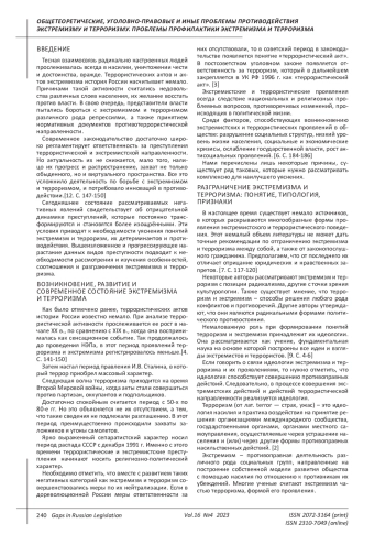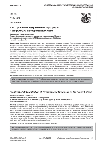 Экстремизм и терроризм - это негативные явления, которые деструктивно влияют на общественную жизнь и развитие государства. Сегодня эти проблемы достаточно актуальны, обсуждаемы и требуют решения. Данные явления наносят вред не только государственной целостности и безопасности, но и нарушают права граждан, подрывают их психическое и физическое здоровье. Современное время предполагает наличие развитого противотеррористического законодательства. Но вместе с ним развивается и расширяется радикальная преступная деятельность. Изощрение преступников прослеживается в их переходе из реальности в виртуальное пространство, где также проводится грамотная агитационная работа и пропаганда в отношении менее защищенных слоев населения. Эти явления не просто негативны, но и достаточно сложны для восприятия, несмотря на подробное и обширное освещение в научной литературе. Авторы не имеют единого понимания данных категорий. Одна из основных задач государства - противодействие экстремизму и терроризму, но статистика показывает, что говорить о решении данной задачи рано. До этого необходимо уяснить понятия, признаки, причины и условия рассматриваемых категорий, которые помогут сформировать подробное представление о них. Вышеизложенное и прогрессирующее нарастание данных видов преступности подводит к необходимости рассмотрения и изучения особенностей, соотношения и разграничения экстремизма и терроризма. Именно на разъяснение этих вопросов направлена научная статья.