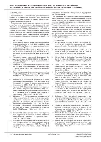 7. Бирюков С.Ю. Общая характеристика экстремизма и анализ современного состояния борьбы с преступлениями экстремистской направленности /С.Ю. Бирюков, М.В. Бобовкин, М.А. Шматов // Legal Concept. - 2020. - №2.. - С. 117-120. EDN: VQTCLI
