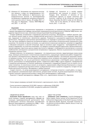 12. Шалагин А.Е. Экстремизм как социально-негативное явление и меры его предупреждения /А.Е. Шалагин, М.Ю. Гребенкин // Деятельность правоохранительных органов по противодействию экстремизму и терроризму: материалы всероссийского круглого стола (г. Казань, 30 ноября 2017 г.) / под. ред. С.Н. Миронова. - Казань: КЮИ МВД России, 2017. - С. 147-150.