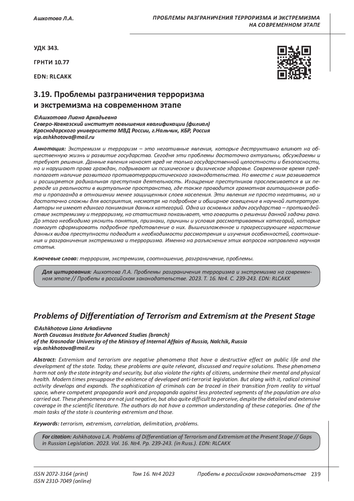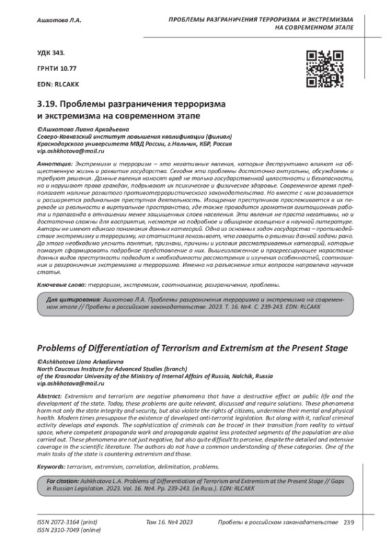 Gedugoshev R.R. International cooperation in law enforcement on countering extremism and terrorism /R.R. Gedugoshev, E.V. Kuznetsova, T.B. Vasilyeva // Journal of Applied Research. - 2021. - №4. - Р. 77-80.
