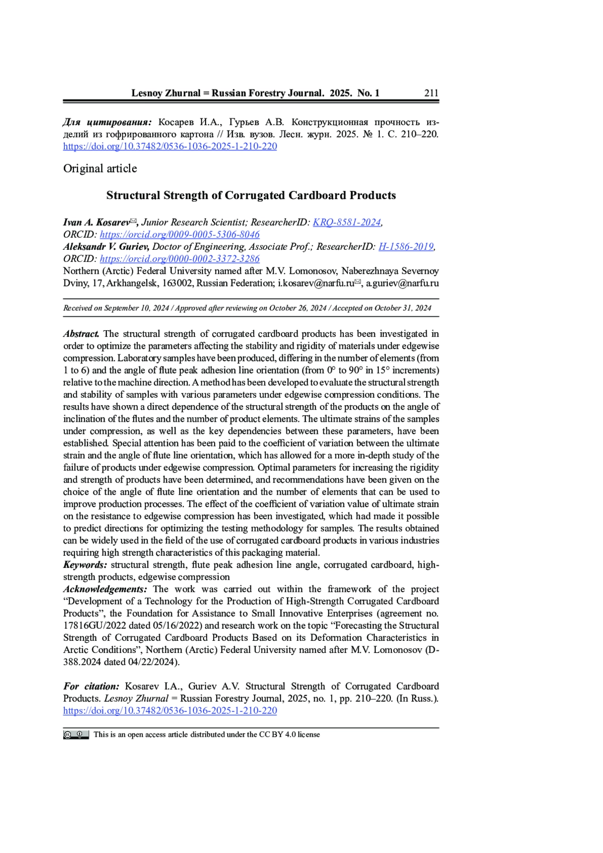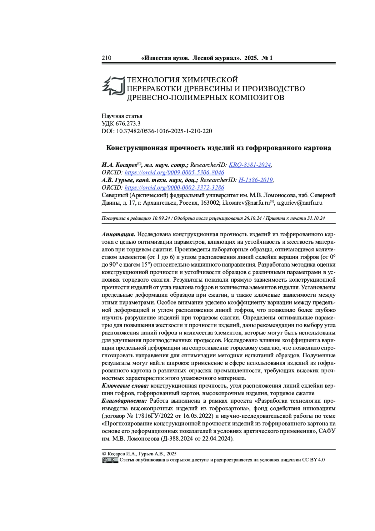 Исследована конструкционная прочность изделий из гофрированного картона с целью оптимизации параметров, влияющих на устойчивость и жесткость материалов при торцевом сжатии. Произведены лабораторные образцы, отличающиеся количеством элементов (от 1 до 6) и углом расположения линий склейки вершин гофров (от 0° до 90° с шагом 15°) относительно машинного направления. Разработана методика оценки конструкционной прочности и устойчивости образцов с различными параметрами в условиях торцевого сжатия. Результаты показали прямую зависимость конструкционной прочности изделий от угла наклона гофров и количества элементов изделия. Установлены предельные деформации образцов при сжатии, а также ключевые зависимости между этими параметрами. Особое внимание уделено коэффициенту вариации между предельной деформацией и углом расположения линий гофров, что позволило более глубоко изучить разрушение изделий при торцевом сжатии. Определены оптимальные параметры для повышения жесткости и прочности изделий, даны рекомендации по выбору угла расположения линий гофров и количества элементов, которые могут быть использованы для улучшения производственных процессов. Исследовано влияние коэффициента вариации предельной деформации на сопротивление торцевому сжатию, что позволило спрогнозировать направления для оптимизации методики испытаний образцов. Полученные результаты могут найти широкое применение в сфере использования изделий из гофрированного картона в различных отраслях промышленности, требующих высоких прочностных характеристик этого упаковочного материала.