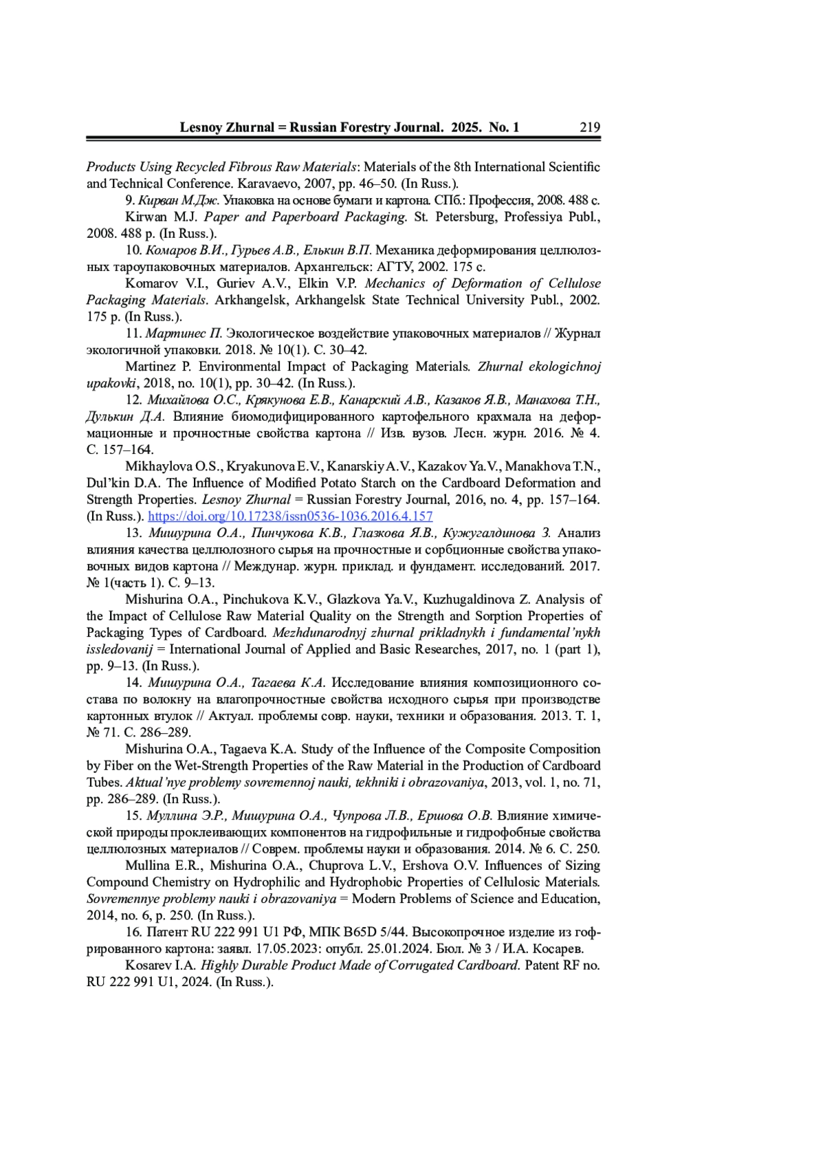 13. Мишурина О.А., Пинчукова К.В., Глазкова Я.В., Кужугалдинова З. Анализ влияния качества целлюлозного сырья на прочностные и сорбционные свойства упаковочных видов картона // Междунар. журн. приклад. и фундамент. исследований. 2017. No 1 (часть 1). С. 9-13. EDN: XUVPJB