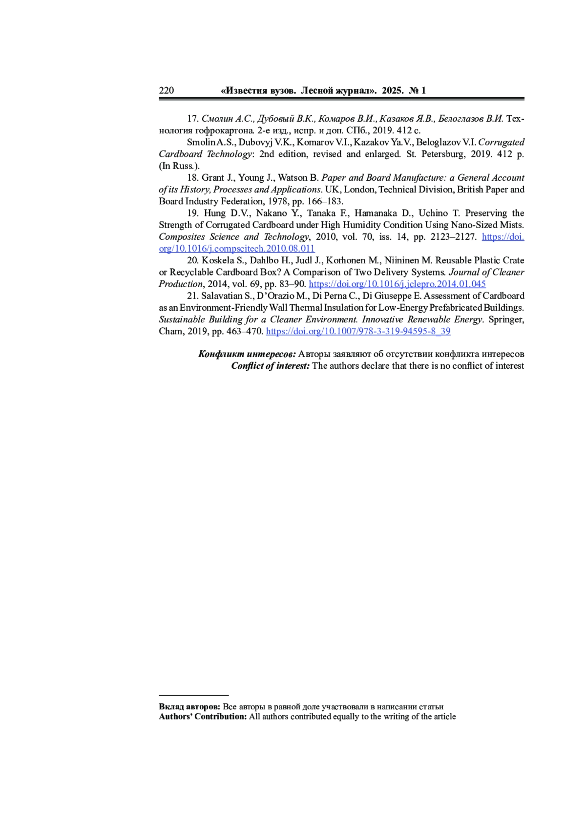 8. Казаков Я.В., Комаров В.И., Лапина Н.В., Журавлева А.Н., Крыжановский А.О. Влияние климатических условий на сохранение уровня потребительских свойств гофрокартона // Теория и инновационные технологии бумажно-картонной продукции с использованием вторичного волокнистого сырья: материалы VIII Междунар. науч.-техн. конф. Караваево, 2007. С. 46-50.