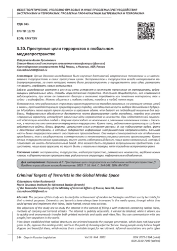 Целью данного исследования было изучение вопросов, связанных с распространением терроризма в киберпространстве, что является большим вредом, чем физический террористический акт. В результате актуализировалась проблема безопасности киберпространства. Так, чтобы сделать безопасным киберпространство, для государства необходимо не только соответствующее законодательство, но и организовать внесение соответствующей практики в различные сферы жизни, например экономическую, социально-культурную, административно-политическую и т. д. Электронное управление существует во всех сферах, оно облегчает и ускоряет проведение многих операций. Задачи исследования состоят в анализе дополнительной опасности для государства, в частности, так как террористы могут удаленно воздействовать на определенные цели и наносить существенный вред, в том числе физический. Установлено, что кибертеррористы могут создавать условия, при которых возможны огромные жертвы со стороны мирных граждан, разрушать объекты инфраструктуры, нагнетать напряжение и страх внутри общества. Кроме того, научных кругах стала широко обсуждаться виктимизация молодежи, которая также является причиной вовлечения их в террористическую деятельность. Эта проблема требует комплексного решения, только тогда удастся достичь положительного результата. Для этого потребуется значительно усовершенствовать российское законодательство, внести соответствующие изменения. Важно развивать компьютерную грамотность молодежи, повышать ее социально-культурный уровень, а также развивать у молодого поколения твердую патриотическую позицию. Сделан вывод о том, что интернет помогает террористам развиваться незаметно от государственных органов. Если раньше террористам для распространения информации проходилось использовать радио, телевидение и печатные издания, то сейчас методы распространения информации изменились и стали намного проще. Через интернет можно искать соратников, проводить вербовку, распространять любые материалы, причем не только текстовые, но и фото и видео, совершать террористические атаки и многое другое. Киберпространство открывает для преступников, способных его освоить широкие возможности.
