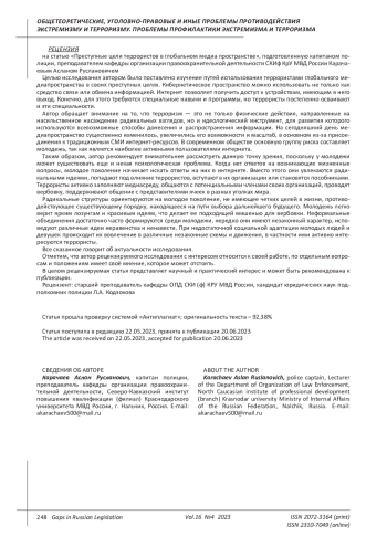Khazhuev I.S., Saidov A.A. The Internet as a medium of radicalization of personality and the formation of extremist sentiments // In the collection: The teacher creates a nation (A-H.A. Kadyrov). Collection of materials of the VII International Scientific and Practical Conference. Makhachkala-Grozny, 2022. pp. 714-722.