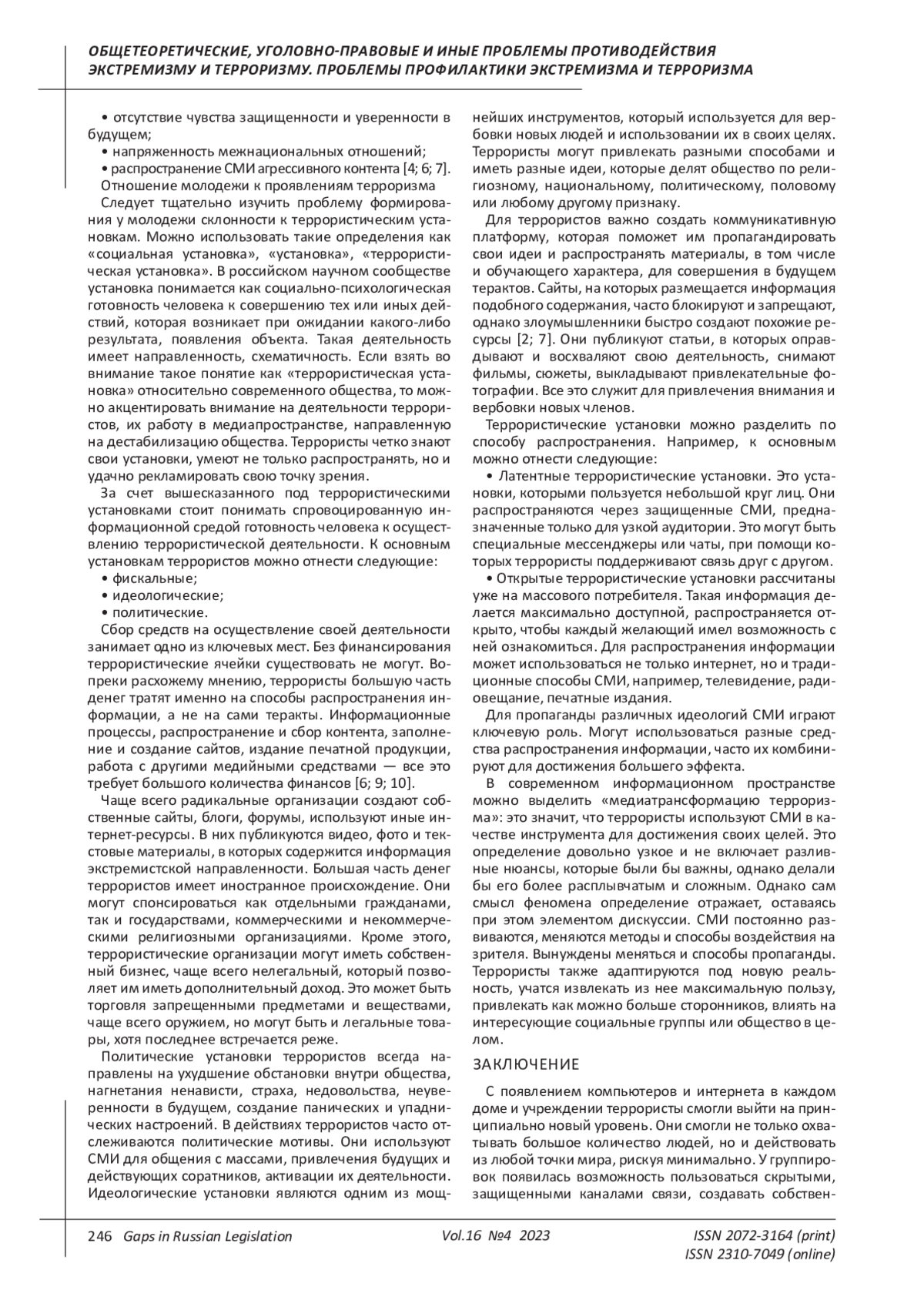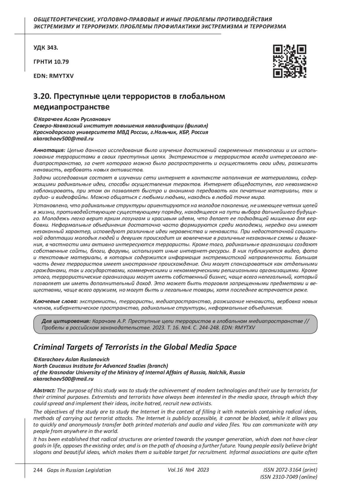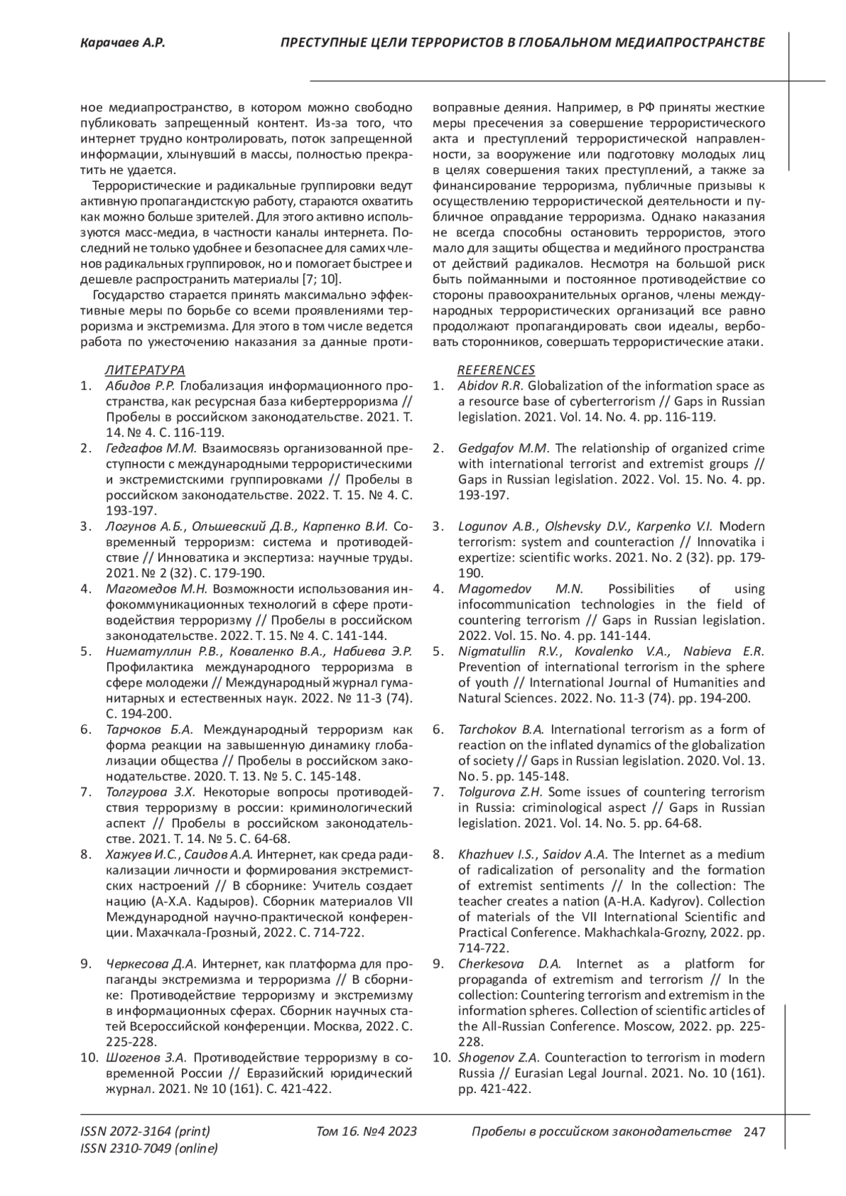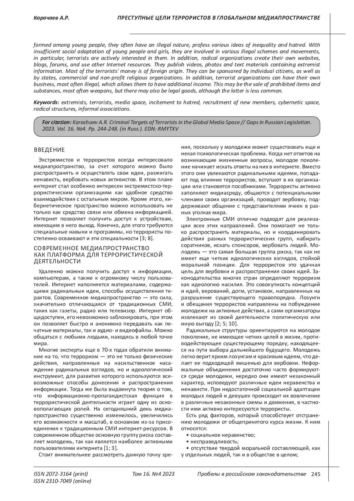 Tolgurova Z.H. Some issues of countering terrorism in Russia: criminological aspect // Gaps in Russian legislation. 2021. Vol. 14. No. 5. pp. 64-68. EDN: WUNDOG