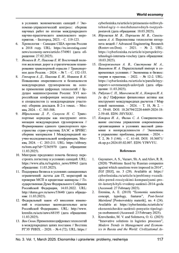 3. Кравченко М. В., Солнцева О. Г. Инновационные решения в логистических процессах // Современные тенденции управления и экономики в России и мире: цивилизационный аспект: материалы VI Всероссийской научно-практической конференции, Москва, 19 декабря 2024 года. - Москва: Издательский дом “УМЦ”, 2025. - С. 173-181. EDN: PIZMBZ
