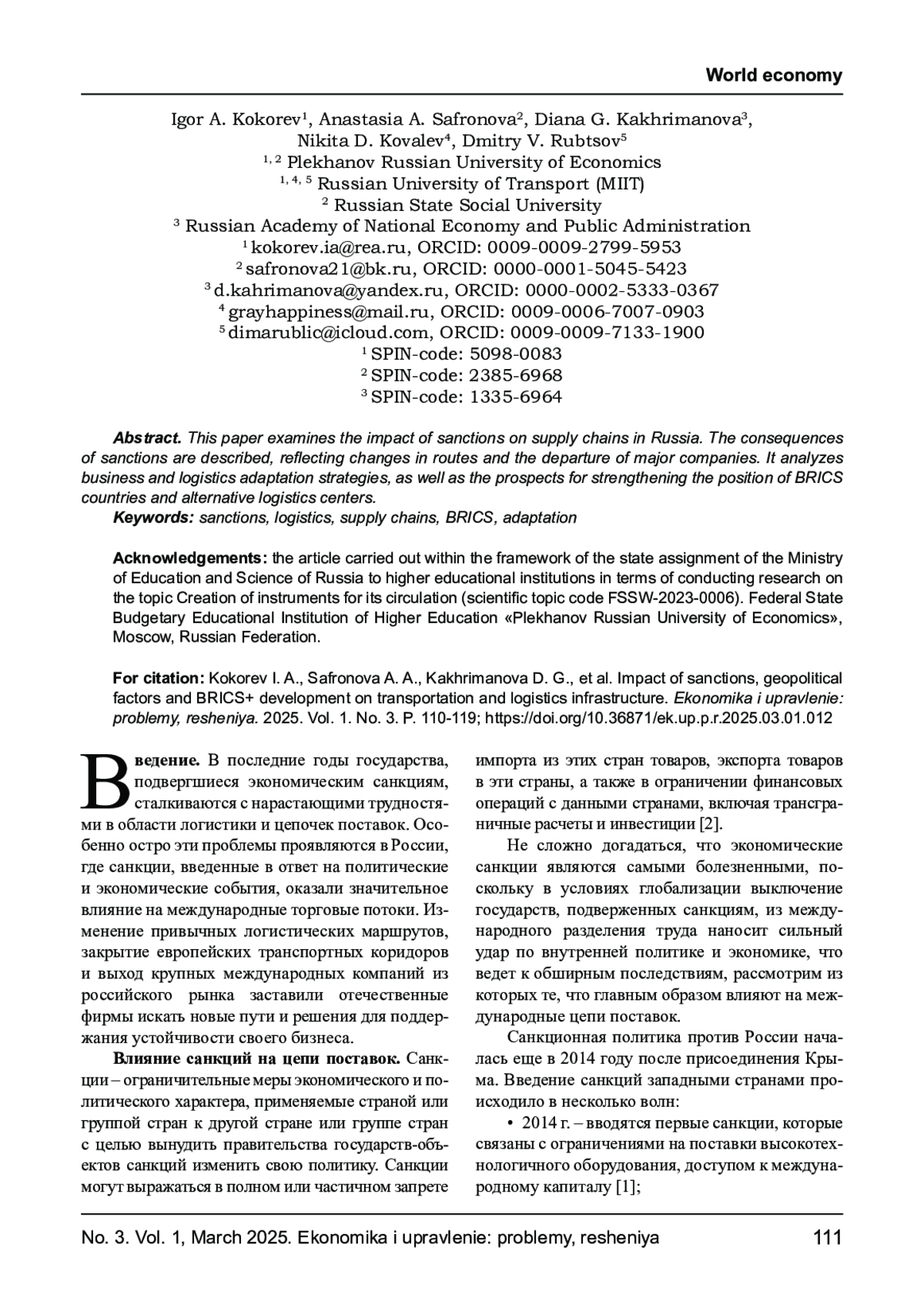 В данной работе рассматривается влияние санкций на цепи поставок в России. Описываются последствия санкций, отражая изменения маршрутов и уход крупных компаний. Анализируются стратегии адаптации бизнеса и логистики, а также перспективы укрепления позиций стран БРИКС и альтернативных логистических центров.