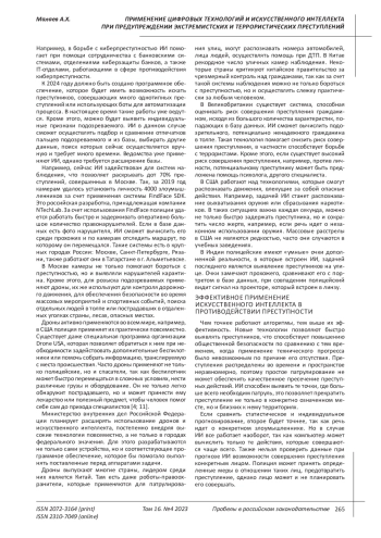 Целью данного исследования является изучение возможностей применения цифровых технологий, а также искусственного интеллекта в деятельности правоохранителей по предупреждению экстремизма и терроризма. Новые технологии позволяют быстро выявлять преступников, что способствует повышению общественной безопасности по сравнению с тем временем, когда применение технического прогресса было невозможным по причине его отсутствия. Преступления распределены во времени и пространстве неравномерно, поэтому простое патрулирование не может обеспечить качественное пресечение преступных действий. Искусственный интеллект способен выявить те точки, где больше всего необходим патруль, это позволяет прекратить преступление не только в конкретно означенном месте, но и близких к нему территориях. Задачи исследования состоят в разработке предложений по расширению возможностей использования цифровых технологий и искусственного интеллекта в процессе осуществления противодействия экстремистским и террористическим преступлениям. Поскольку искусственный интеллект помогает быстро обработать большое количество информации, это позволяет применять данную технологию в разных сферах жизни. Она может решать разнообразные задачи, в том числе оказывать помощь при расследовании преступлений. Подобные технологии позволяют ускорить темпы развития общества, превратить рутинную работу, отнимающую много времени, в быстрый анализ компьютером, который займет несколько минут. Искусственный интеллект способствует развитию экономики, общества, повышению общественной безопасности, помогает правоохранительным органам решать различные задачи. Сделан вывод о том, что искусственный интеллект не имеет собственного разума и не наделен способностью отличать, законные он совершает действия или нет. Именно поэтому его можно использовать как во благо, так и во вред. Например, в борьбе с киберпреступностью ИИ помогает при помощи сотрудничества с банковскими системами, отделениями киберзащиты банков, а также IT-отделами, работающими в сфере противодействия киберпреступности.