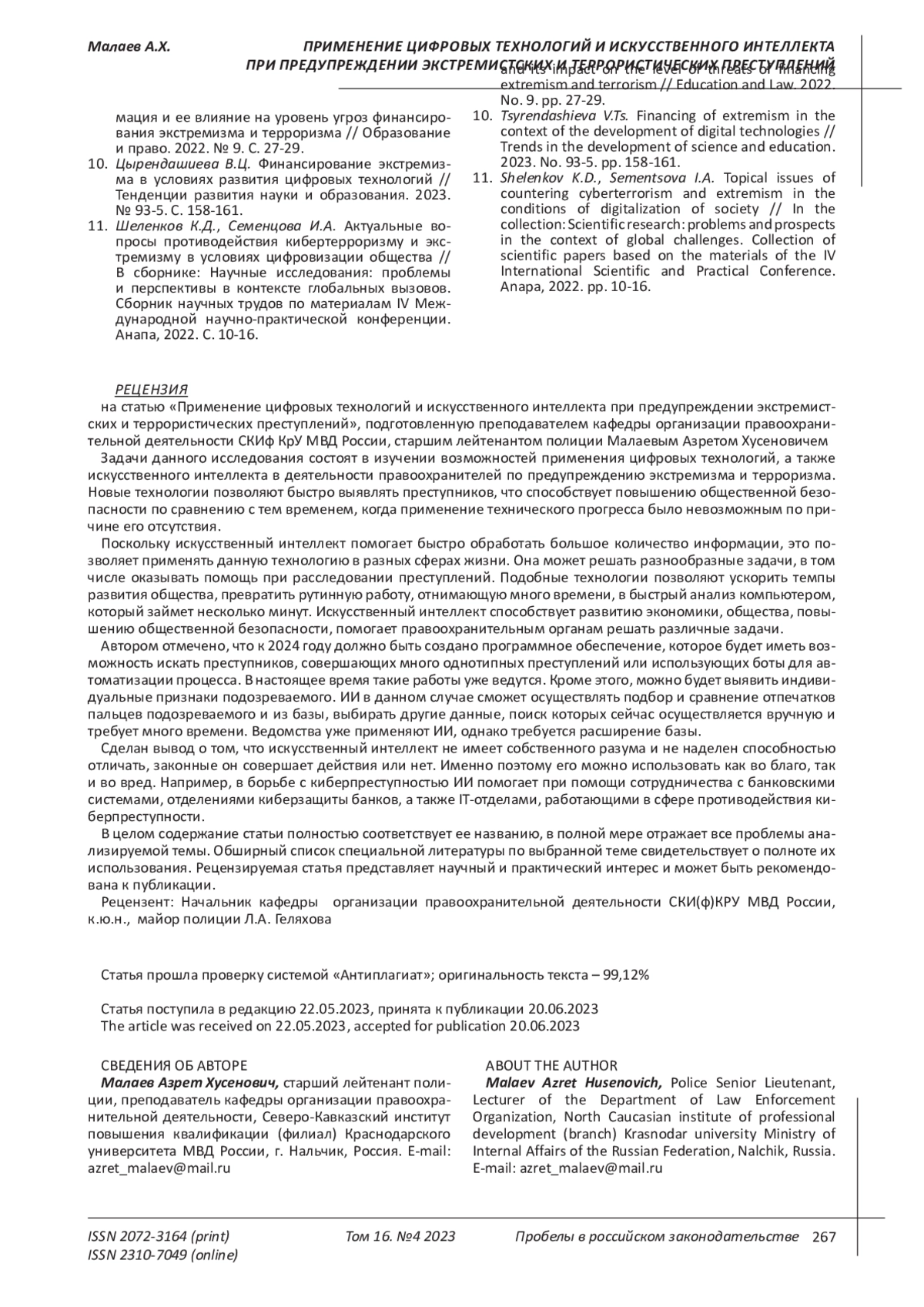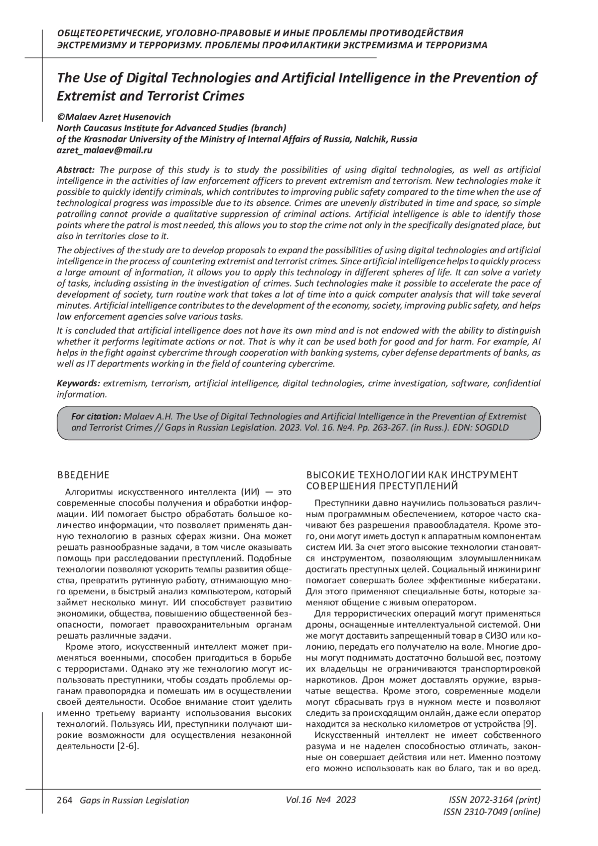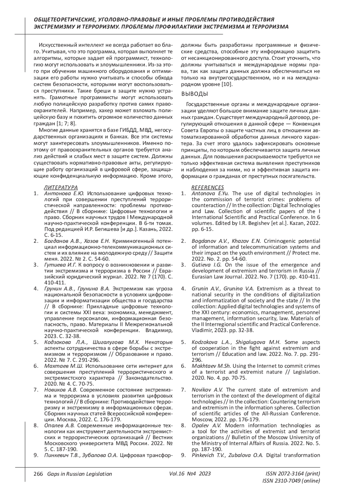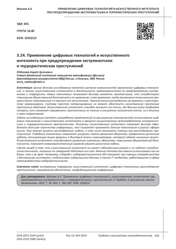 7. Новиков А.В. Современное состояние экстремизма и терроризма в условиях развития цифровых технологий // В сборнике: Противодействие терроризму и экстремизму в информационных сферах. Сборник научных статей Всероссийской конференции. Москва, 2022. С. 176-179. EDN: YMRUGJ