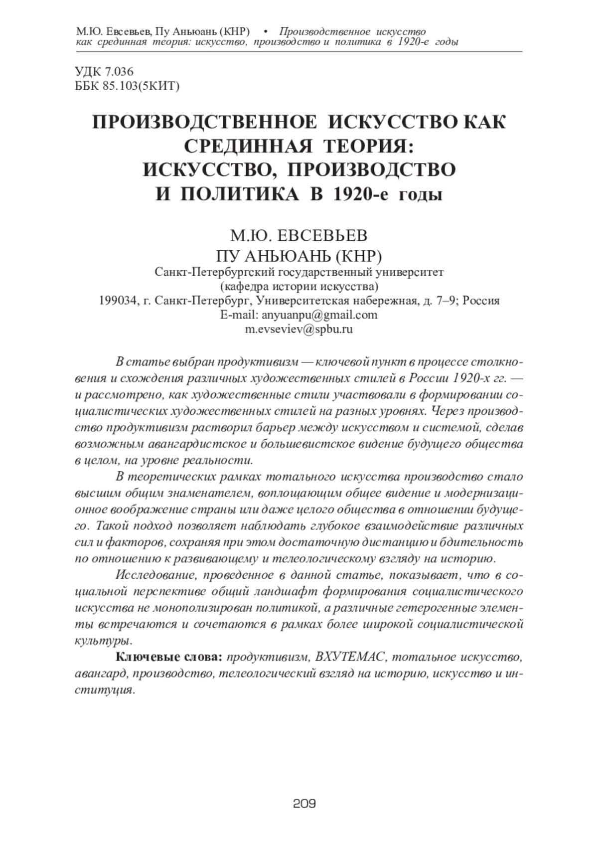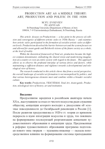 ЕВСЕВЬЕВ М. Ю., ПУ А. ПРОИЗВОДСТВЕННОЕ ИСКУССТВО КАК СРЕДИННАЯ ТЕОРИЯ: ИСКУССТВО, ПРОИЗВОДСТВО И ПОЛИТИКА В 1920-Е ГОДЫ // ТЕОРИЯ И ИСТОРИЯ ИСКУССТВА. 2024. № 1-2