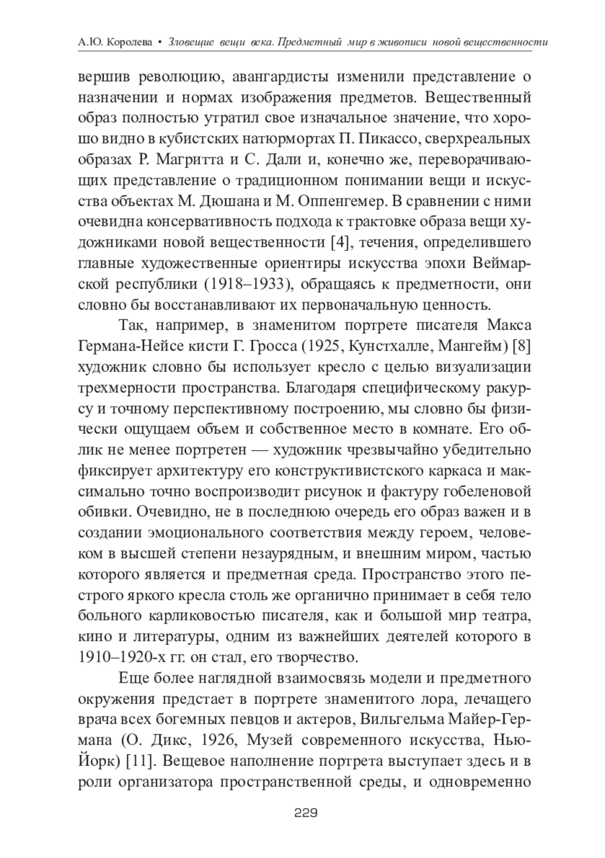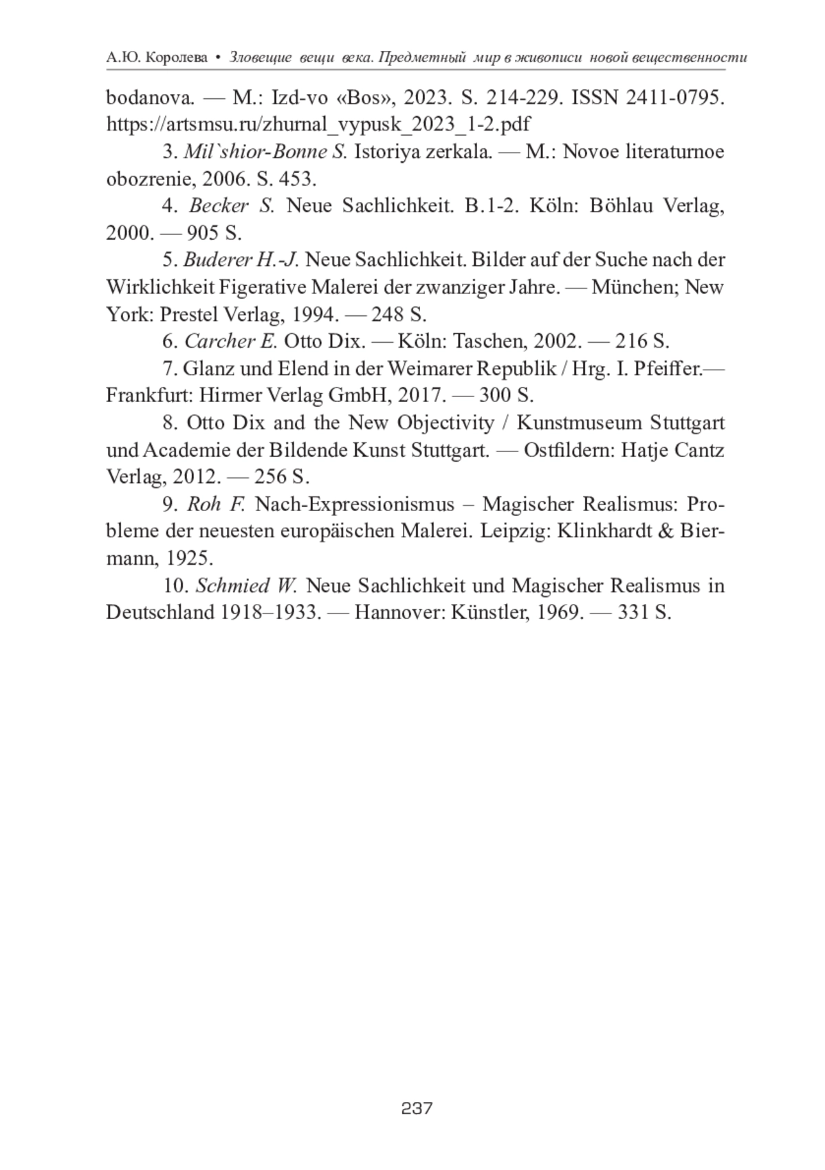 2. Королева А. Ю. Рецепция классики в живописи новой вещественности // Теория и история искусства. Вып.1-2, 2023. Под ред. А. П. Лободанова. - М.: Изд-во “Бос”, 2023. С. 214-229. ISSN 2411-0795. https://artsmsu.ru/zhurnal_vypusk_2023_1-2.pdf. EDN: JWPVSH