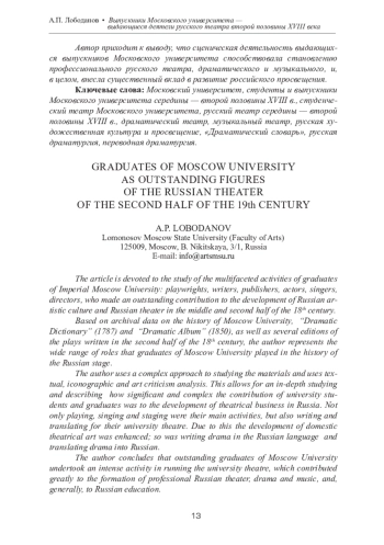 Статья посвящена исследованию многогранной деятельности выпускников Императорского Московского университета, — драматургов, писателей, издателей, актеров, певцов, постановщиков, внесших выдающийся вклад в развитие отечественной художественной культуры и русского театра середины — второй половины XVIII в. На материале анализа архивных данных по истории Московского университета, текстов «Драматического словаря» (1787) и «Драматического альбома» (1850), изданий пьес второй половины XVIII в. автор воссоздает картину деятельности выпускников Московского университета в истории русской сцены. Автор базируется на методологии комплексного текстового, иконографического и искусствоведческого анализа, что позволяет глубже показать историческое значение и роль студентов и выпускников университета в развитии театрального дела в России — не только играют, поют, ставят, но и пишут и переводят для своей сцены, — что способствовало развитию отечественного театрального искусства, русской оригинальной и переводной драматургии.
