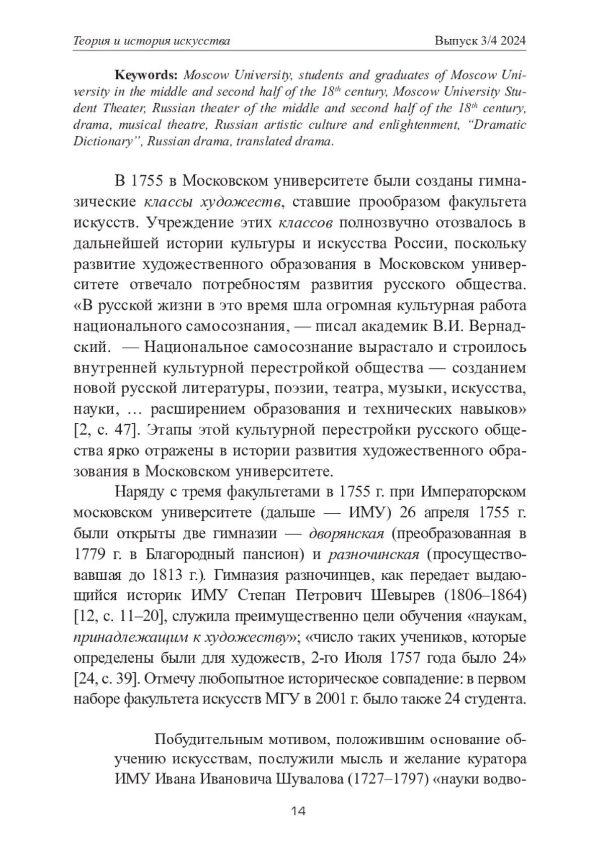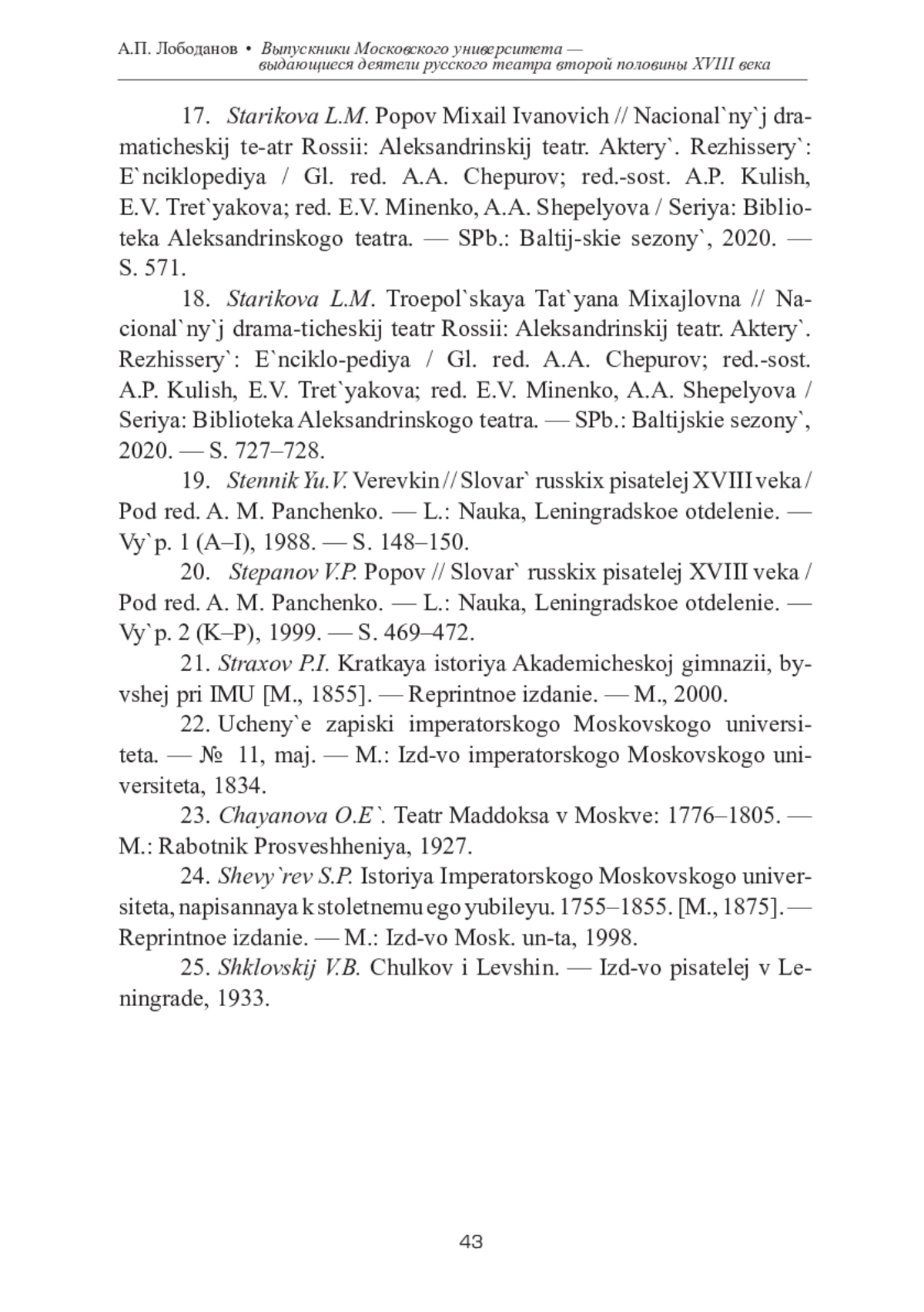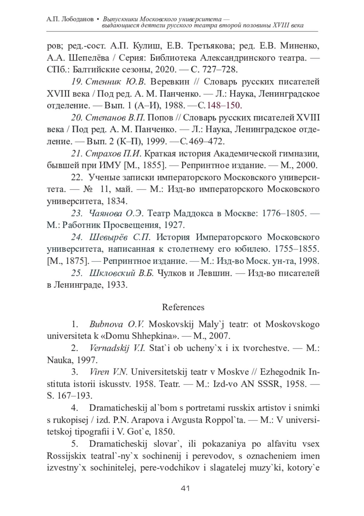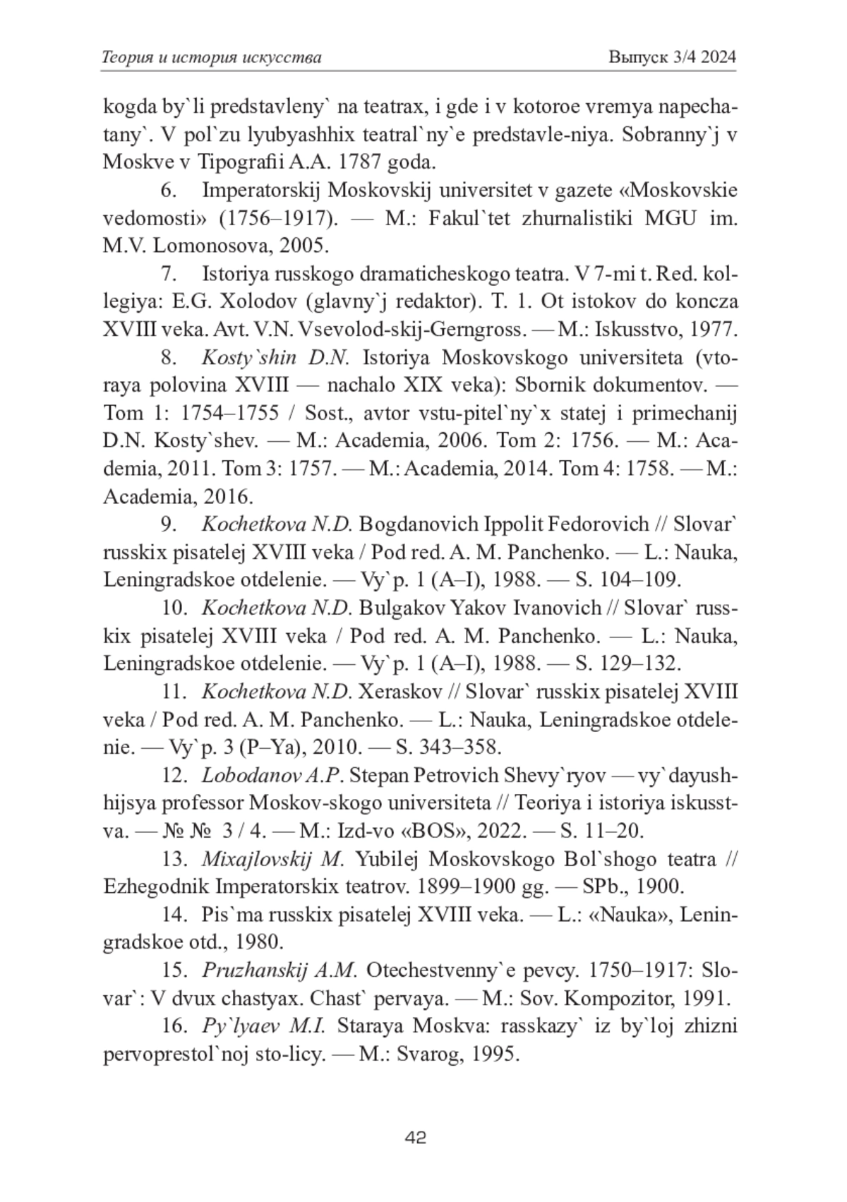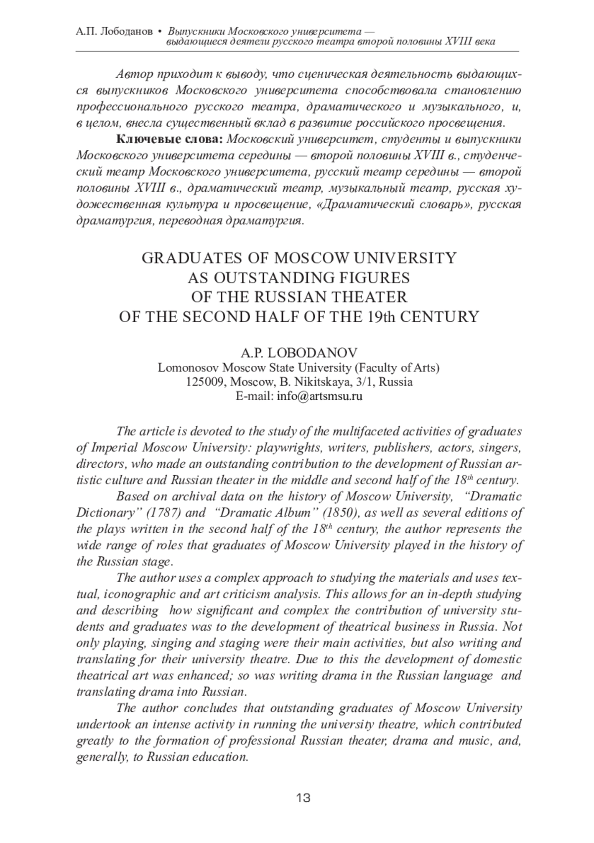 ЛОБОДАНОВ А. П. ВЫПУСКНИКИ МОСКОВСКОГО УНИВЕРСИТЕТА - ВЫДАЮЩИЕСЯ ДЕЯТЕЛИ РУССКОГО ТЕАТРА ВТОРОЙ ПОЛОВИНЫ XVIII ВЕКА // ТЕОРИЯ И ИСТОРИЯ ИСКУССТВА. 2024. № 3-4