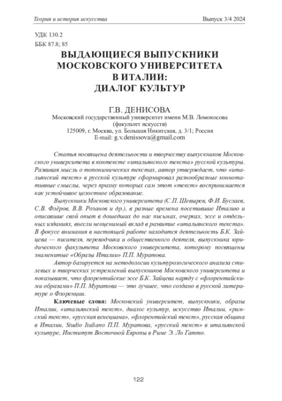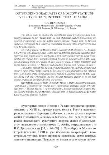 Статья посвящена деятельности и творчеству выпускников Московского университета в контексте «итальянского текста» русской культуры. Развивая мысль о топонимических текстах, автор утверждает, что «итальянский текст» в русской культуре сформировал разнообразные коннотативные смыслы, через призму которых сам этот «текст» воспринимается как устойчивое целостное образование. Выпускники Московского университета (С. П. Шевырев, Ф. И. Буслаев, С. В. Флëров, В. В. Розанов и др.), в разные времена посетившие Италию и описавшие свой опыт в дошедших до нас письмах, очерках, эссе и отдельных изданиях, внесли неоценимый вклад в развитие «итальянского текста». В фокусе внимания в настоящей работе находится деятельность Б. К. Зайцева — писателя, переводчика и общественного деятеля, выпускника юридического факультета Московского университета, которому посвящены знаменитые «Образы Италии» П. П. Муратова. Автор базируется на методологии культурологического анализа стилевых и творческих устремлений выпускников Московского университета и показывает, что флорентийские эссе Б. К. Зайцева наряду с «флорентийскими образами» П. П. Муратова — это лучшее, что создано в русской литературе о Флоренции