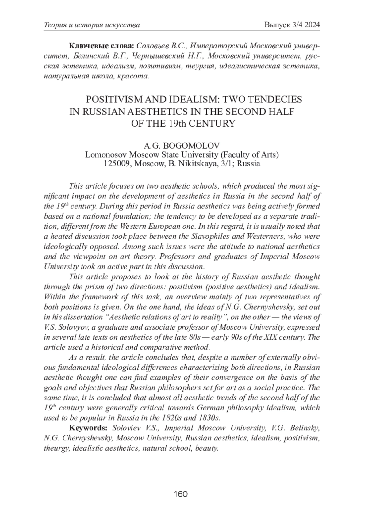 Настоящая статья представляет собой обзор двух наиболее значимых эстетических учений, ознаменовавших собой пространство русской эстетической мысли во второй половине XIX столетия. Русская эстетическая мысль этого периода активно нащупывает национальную основу, стремиться осмыслить себя как особую, отличную от западноевропейской, традицию. В этой связи обычно отмечают бурную дискуссию между славянофилами и западниками, — идейными противниками во многих вопросах, в том числе касающихся отечественной эстетики и теории искусства. В этой дискуссии активное участие принимали преподаватели и выпускники Императорского Московского университета. В настоящей статье предлагается взглянуть на историю русской эстетической мысли сквозь призму двух направлений: позитивизма (положительная эстетика) и идеализма. В рамках этой задачи дается обзор преимущественно двух представителей той и другой позиций. С одной стороны, идеи Н. Г. Чернышевского, изложенные в его диссертации «Эстетические отношения искусства к действительности», с другой — взгляды В. С. Соловьева, выпускника и доцента Московского университета, высказанные в нескольких поздних текстах по эстетике конца 80-х — начала 90-х годов XIX века. В статье использовался историко-сравнительный метод. В качестве результата, в статье делается вывод, что, несмотря на ряд внешне очевидных принципиальных идеологических различий, характеризующих оба направления, в отечественной эстетической мысли можно найти примеры их сближения на почве тех целей и задач, которые ставят русские философы перед искусством как социальной практикой. И вместе тем хорошо заметна общая критическая позиция практически всех эстетических направлений второй половины XIX века по отношению к идеализму немецкой философии, столь популярной в России в 1820–1830 гг.