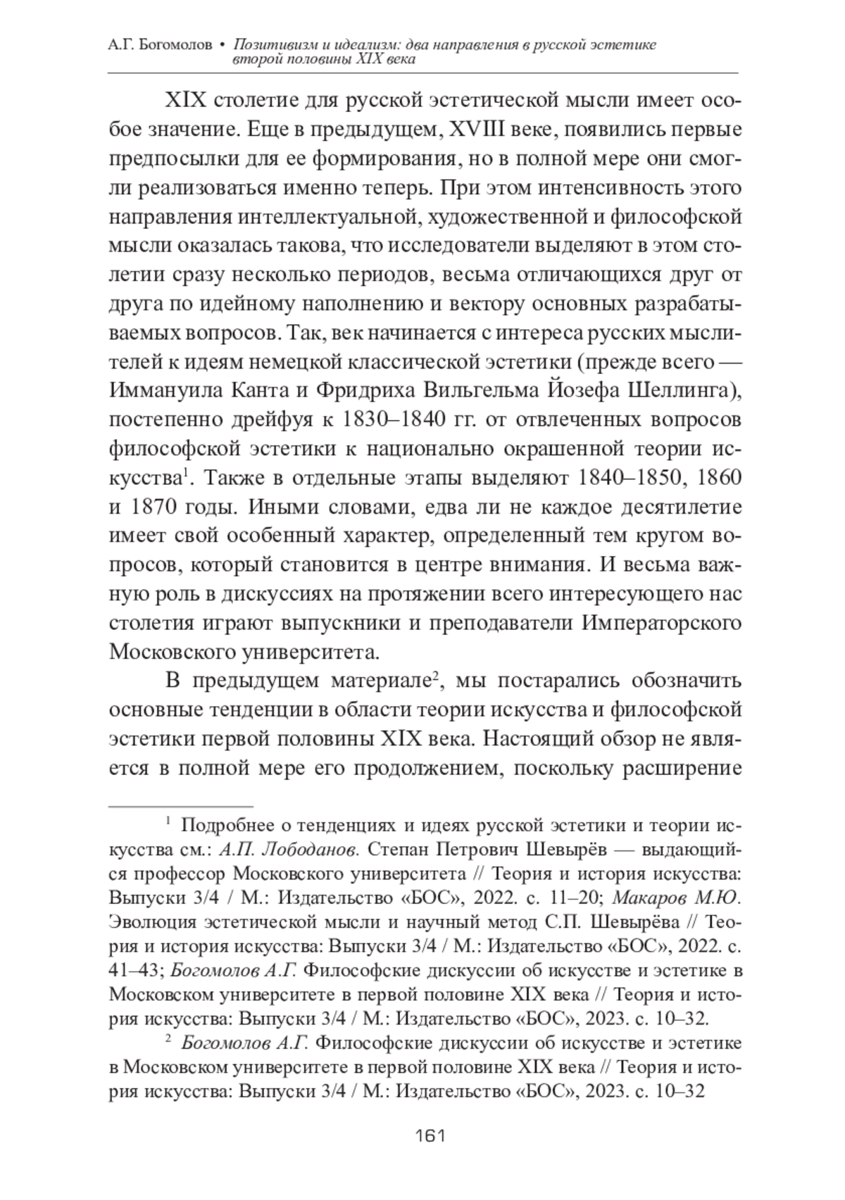 XIX столетие для русской эстетической мысли имеет особое значение. Еще в предыдущем, XVIII веке, появились первые предпосылки для ее формирования, но в полной мере они смогли реализоваться именно теперь. При этом интенсивность этого направления интеллектуальной, художественной и философской мысли оказалась такова, что исследователи выделяют в этом столетии сразу несколько периодов, весьма отличающихся друг от друга по идейному наполнению и вектору основных разрабатываемых вопросов. Так, век начинается с интереса русских мыслителей к идеям немецкой классической эстетики (прежде всего — Иммануила Канта и Фридриха Вильгельма Йозефа Шеллинга), постепенно дрейфуя к 1830–1840 гг. от отвлеченных вопросов философской эстетики к национально окрашенной теории искусства1.