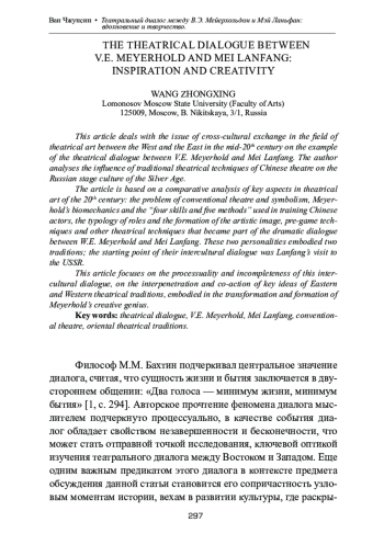 В данной статье рассматривается вопрос о кросс-культурном обмене в области театрального искусства между Западом и Востоком в середине XX века на примере театрального диалога между В. Э. Мейерхольдом и Мэй Ланьфаном. Автор анализирует влияние традиционных театральных приемов китайского театра на русскую сценическую культуру Серебряного века. В основе статьи — сравнительный анализ ряда ключевых аспектов театрального искусства прошлого века: проблемы условного театра и символизма, биомеханики Мейерхольда и «четырех навыков и пяти методов», использовавшихся при подготовке актеров китайских актеров, типологии ролей и формирования художественного образа, техники предыгры и других театральных приемов, которые стали частью воплощающего две традиции драматического диалога между В. Э. Мейерхольдом и Мэй Ланьфаном, точкой отсчета которого стал визит Ланьфана в СССР. В данной статье акцент делается на процессуальности и незавершенности этого межкультурного диалога, на взаимопроникновении и резонансе от соприкосновения ключевых идей восточных и западных театральных традиций, воплощенных в трансформации и становлении творческого гения Мейерхольда