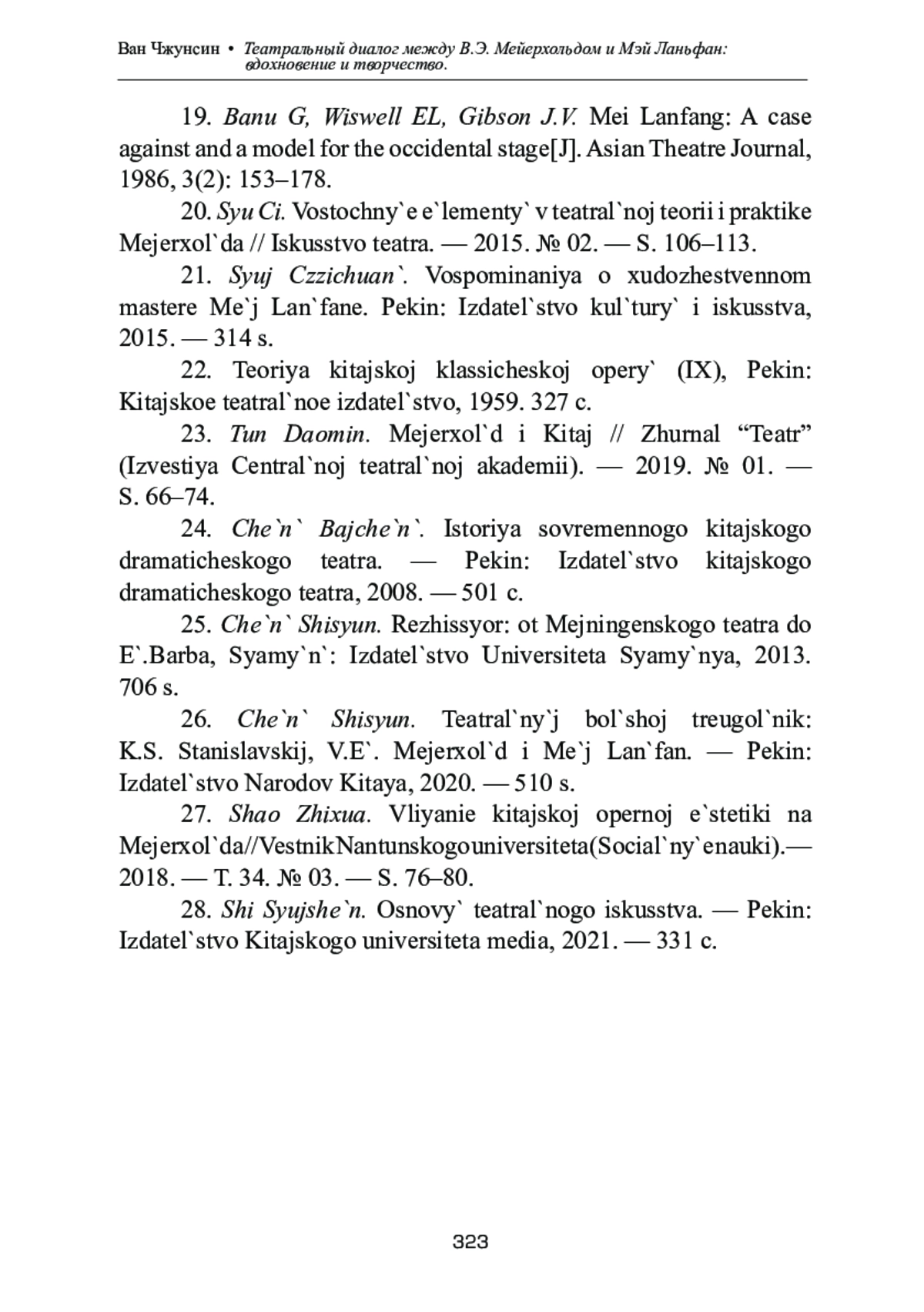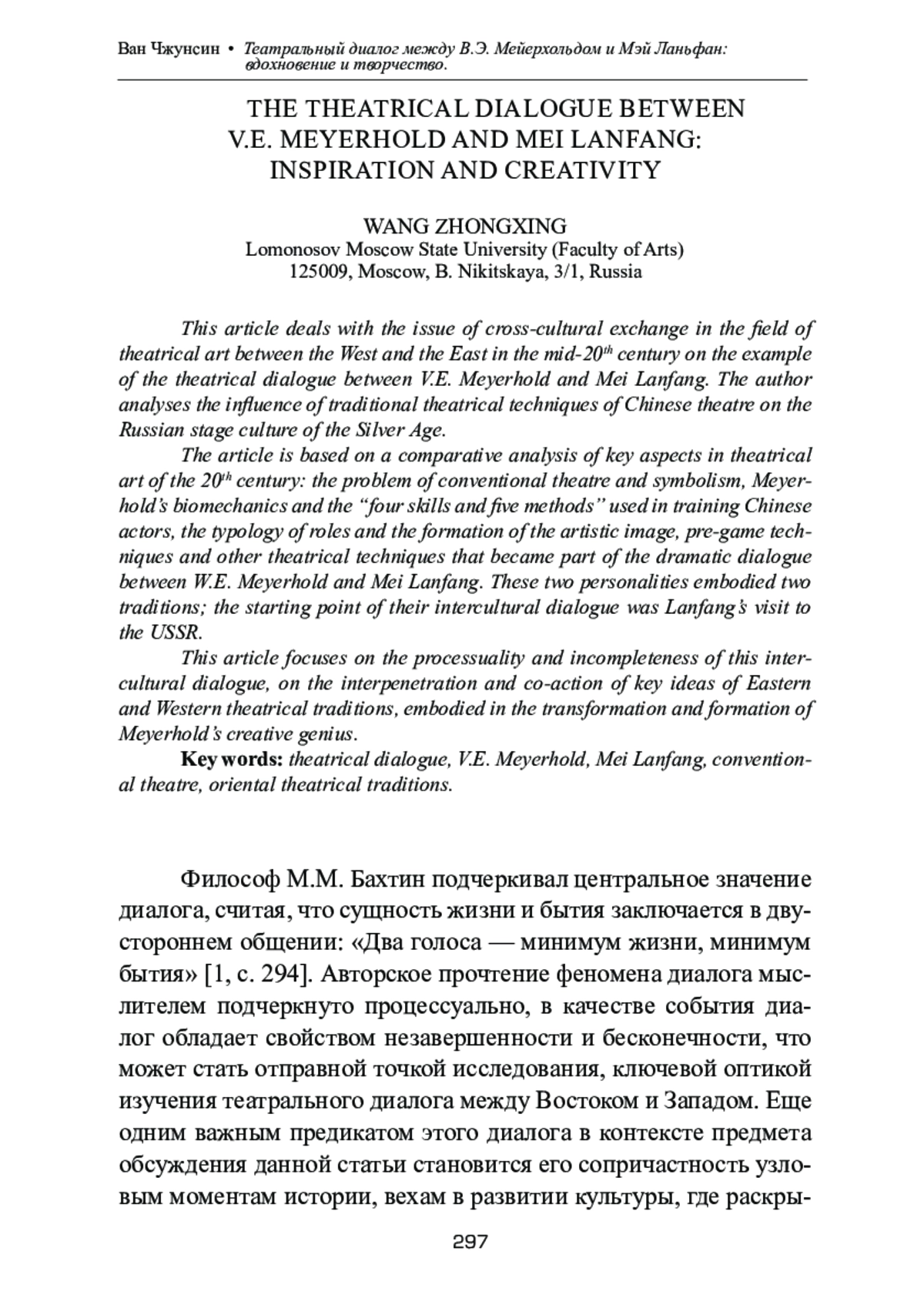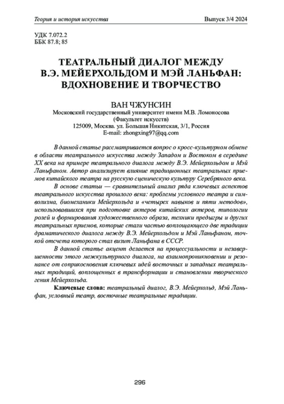 ВАН Ч. ТЕАТРАЛЬНЫЙ ДИАЛОГ МЕЖДУ В. Э. МЕЙЕРХОЛЬДОМ И МЭЙ ЛАНЬФАН: ВДОХНОВЕНИЕ И ТВОРЧЕСТВО // ТЕОРИЯ И ИСТОРИЯ ИСКУССТВА. 2024. № 3-4