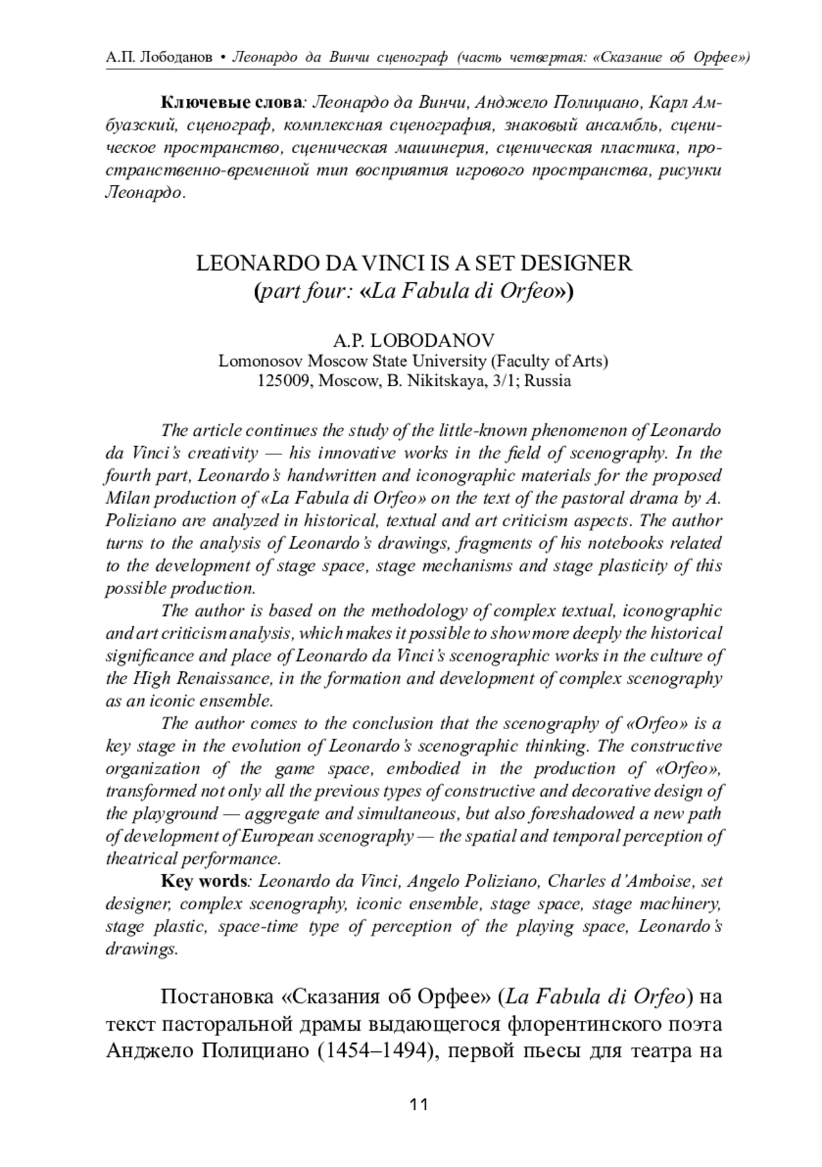 Статья продолжает исследование малоизвестного феномена творчества Леонардо да Винчи — его инновационных работ в области сценографии. В четвертой части анализируются в историко-текстологическом и искусствоведческом аспектах рукописные и иконографические материалы Леонардо к предполагаемой миланской постановке «Сказания об Орфее» на текст пасторальной драмы А. Полициано. Автор обращается к анализу рисунков Леонардо, фрагментов его записных тетрадей, относящихся к разработке сценического пространства, сценических механизмов и сценической пластики этой возможной постановки. Автор базируется на методологии комплексного текстового, иконографического и искусствоведческого анализа, что позволяет глубже показать историческое значение и место сценографических работ Леонардо да Винчи в культуре Высокого Возрождения, в становлении и развитии комплексной сценографии как знакового ансамбля. Автор приходит к выводу, что сценография «Орфея» — ключевой этап эволюции сценографического мышления Леонардо. Конструктивная организация игрового пространства, воплощенная в постановке «Орфея», преобразила не только все предшествовавшие типы конструктивно-декорационного оформления игровой площадки — агрегатный и симультанный, но и предварило новый путь развития европейской сценографии — пространственно-временное восприятие театрального представления