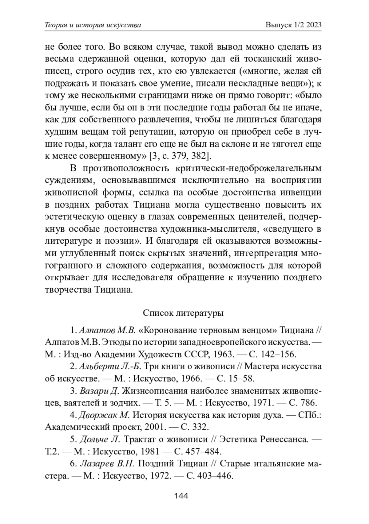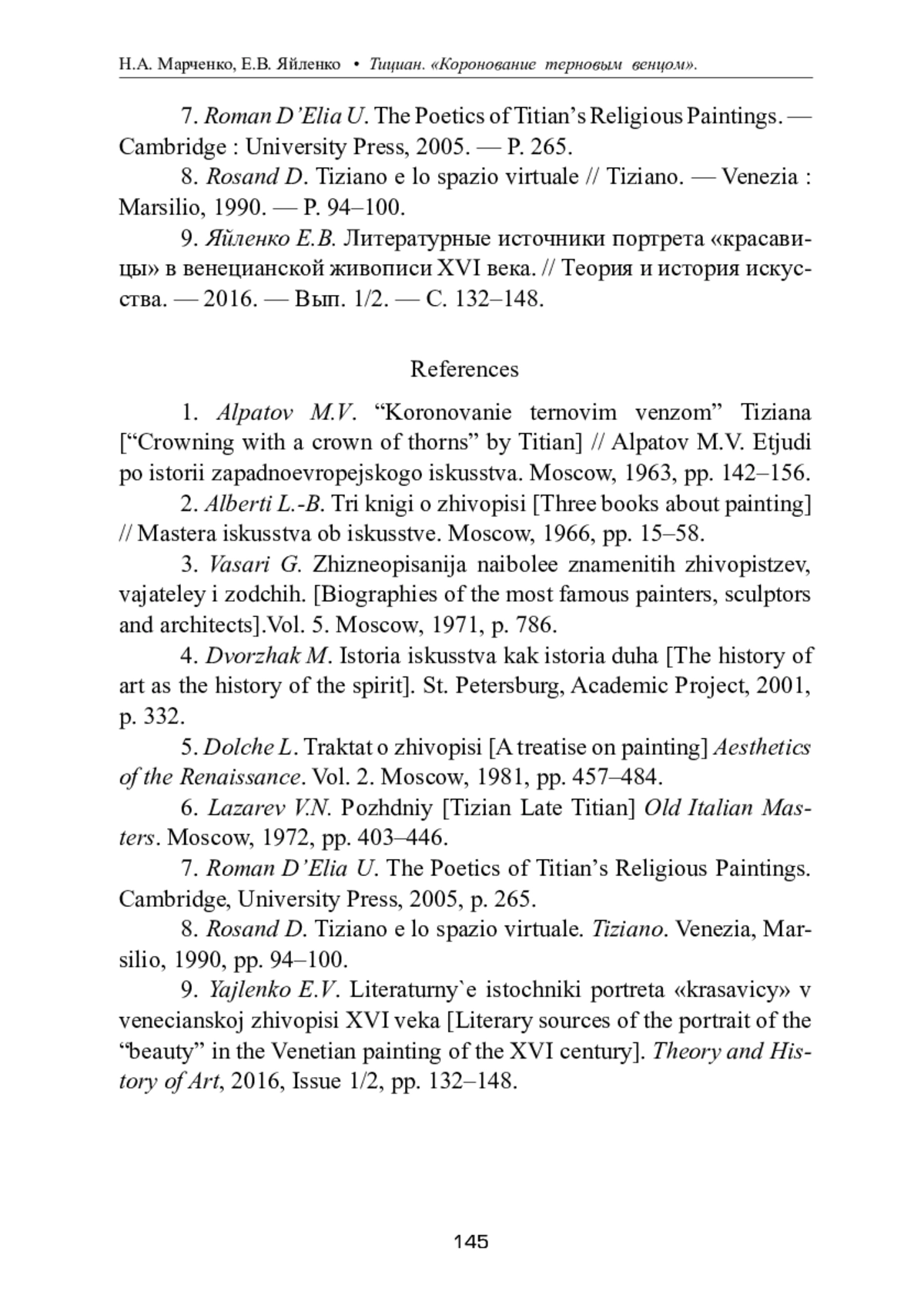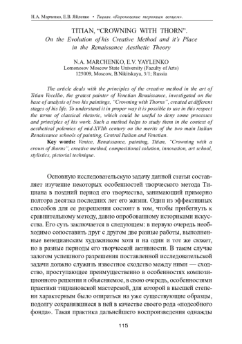 МАРЧЕНКО Н. А., ЯЙЛЕНКО Е. В. ТИЦИАН. "КОРОНОВАНИЕ ТЕРНОВЫМ ВЕНЦОМ". ЭВОЛЮЦИЯ ТВОРЧЕСКОГО МЕТОДА ХУДОЖНИКА И ЕГО МЕСТО В КОНТЕКСТЕ ЭСТЕТИЧЕСКОЙ ТЕОРИИ ЭПОХИ ВОЗРОЖДЕНИЯ // ТЕОРИЯ И ИСТОРИЯ ИСКУССТВА. 2023. № 1-2