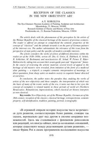 В статье рассматривается феномен восприятия художниками Веймарской республики классического наследия мастеров предыдущих эпох. Читателю предлагается попытка осмысления семиотических свойств понятия «классического» и отношения к нему со стороны немецких живописцев межвоенной эпохи. Автор обосновывает актуальность данной проблематики в ракурсе государственной политики и специфики научных интересов современности. В статье рассмотрены работы художников разных направлений внутри реалистического искусства 1920–1930-х гг, веристов (О. Дикса, Г. Гросса, К. Хуббуха, Г. Шольца, Р. Шлихтера, М. Бекманна) и неоклассицистов (К. Шада, В. Пейнера, Е. Рютер-Рабинович), с учетом их авангардного прошлого и «дегенеративного» будущего. В ходе рассмотрения художественного материала были выявлены несколько уровней обращения к наследию старых мастеров от имитации формы средневековой алтарной картины — триптиха, сложной семантической интерпретации смыслов, до прямого цитирования, от острой сатиры на современное общество до изысканного юмора, обращенного на самих себя. В заключение автор отмечает парадокс: изучая работы художников новой вещественности и те образцы, интерпретация которых лежала в основе многих из знаковых произведений эпохи, оказывается, что в ее глазах понятие образцового имеет отношение преимущественно к тем периодам мирового искусства (северное возрождение, романтизм, импрессионизм), которые классическое искусствознание трактует как неклассические