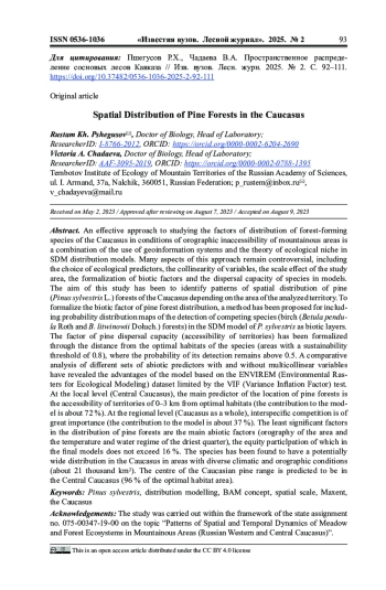 Эффективным подходом к изучению факторов распространения лесообразующих видов Кавказа в условиях орографической труднодоступности горных территорий является сочетание использования геоинформационных систем и теории экологической ниши в моделях распределения SDM. Дискуссионными остаются многие аспекты данного подхода, в т. ч. выбор экологических предикторов, коллинеарность переменных, эффект масштаба исследуемой территории, формализация в моделях биотических факторов и расселительной способности видов. Цель статьи - выявить закономерности пространственного распределения сосновых лесов Кавказа (Pinus sylvestris L.) в зависимости от площади анализируемой территории. Для формализации биотического фактора распространения сосняков предложен метод включения карт распределения вероятностей обнаружения видов-конкурентов (березовые леса из Betula pendula Roth и B. litwinowii Doluch.) в SDM-модель P. sylvestris в качестве биотических слоев. Фактор расселительной способности сосны (доступности территорий) формализован через расстояние от оптимальных местообитаний вида (участков с порогом пригодности 0,8), на которых вероятность его обнаружения сохраняется выше 0,5. Сравнительный анализ разных наборов абиотических предикторов с учетом мультиколлинеарных переменных и без него выявил преимущества модели, полученной на основе набора данных ENVIREM (Environmental Rasters for Ecological Modeling), ограниченного VIF-тестом (Variance Inflation Factor). На локальном уровне (Центральный Кавказ) основным предиктором расположения сосновых лесов выступает доступность территорий - 0-3 км от оптимальных местообитаний (вклад в модель - около 72 %). На региональном уровне (Кавказ в целом) большое значение имеет межвидовая конкуренция (вклад в модель - около 37 %). Наименее значимы в распространении сосновых лесов основные абиотические факторы (орография местности и температурно-водный режим самого сухого квартала), долевое участие которых в итоговых моделях не превышает 16 %. Для вида установлено потенциально широкое распространение на Кавказе в районах с разнообразными климатическими и орографическими условиями (около 21 тыс. км2). Центр кавказского ареала сосны прогнозируется на Центральном Кавказе (96 % площади оптимальных местообитаний).