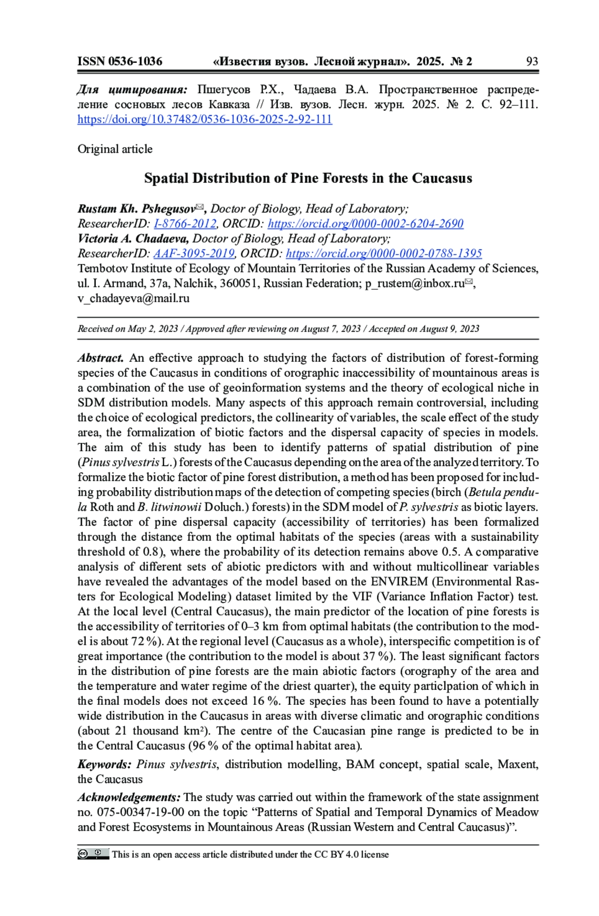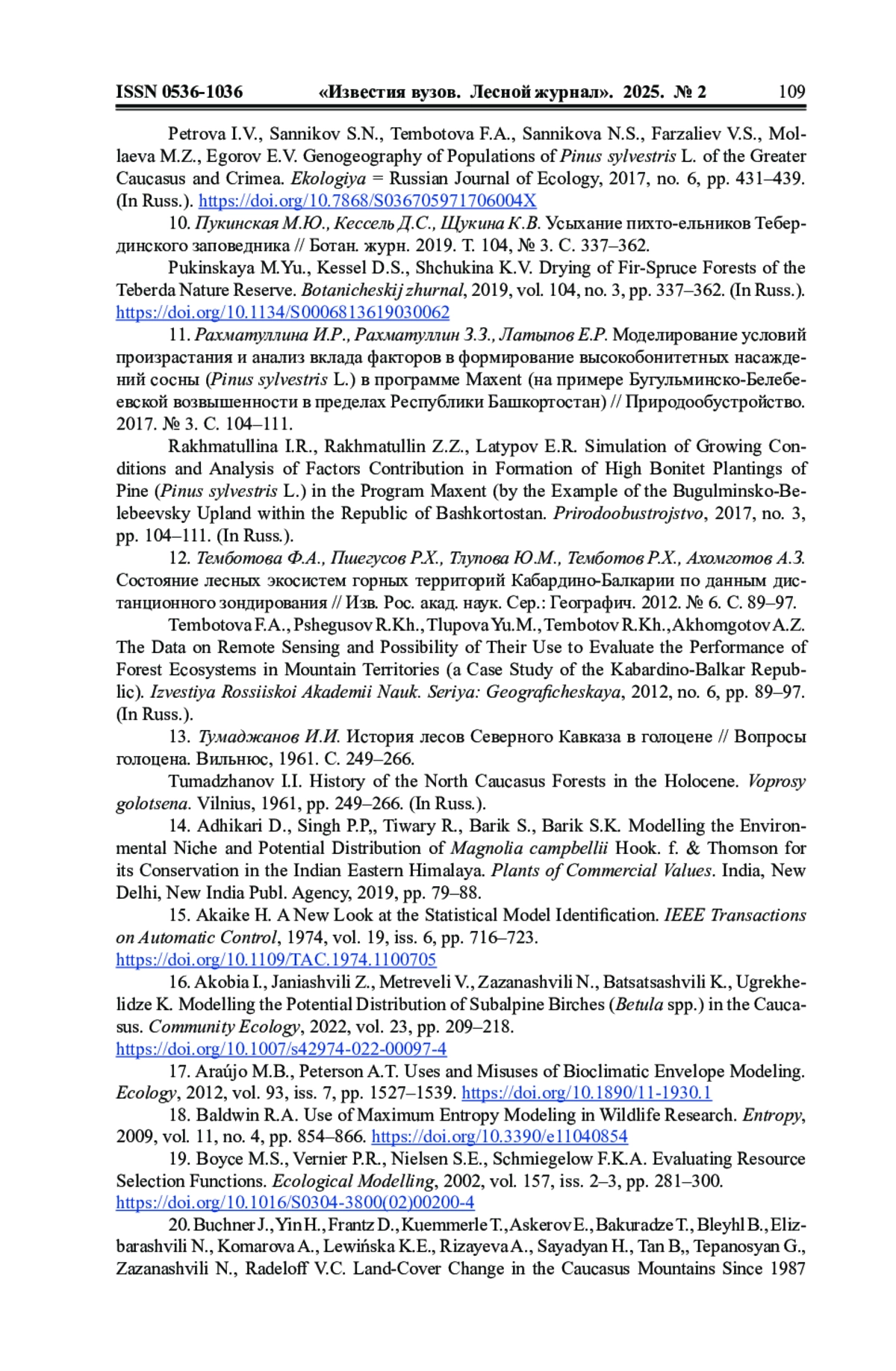 35. Pshegusov R., Tembotova F., Chadaeva V., Sablirova Y., Mollaeva M., Akhomgotov A. Ecological Niche Modeling of the Main Forest-Forming Species in the Caucasus. Forest Ecosystems, 2022, vol. 9, art. no. 100019. DOI: 10.1016/j.fecs.2022.100019 EDN: IELQNZ