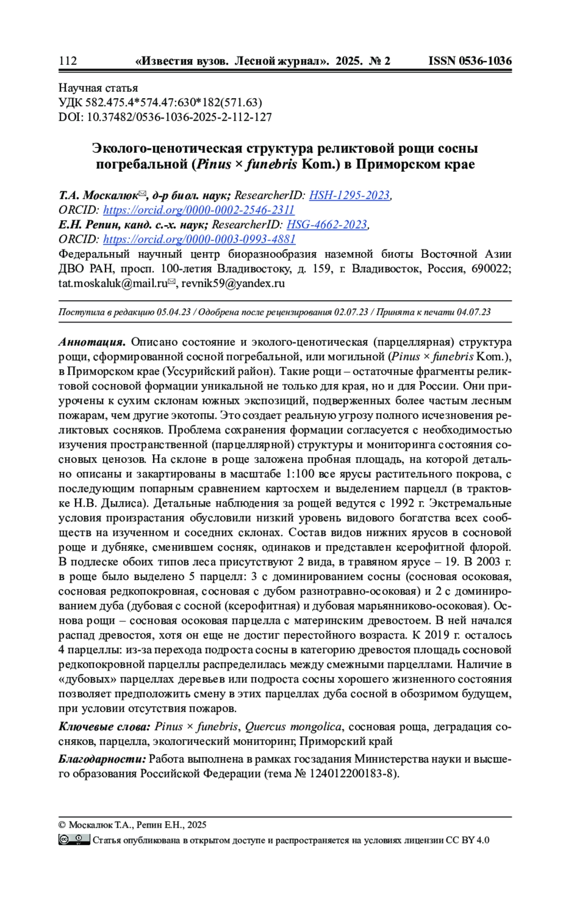 12. Москалюк Т.А., Репин Е.Н. О мониторинге естественной динамики лесов Южного Приморья на примере соснового и дубового сообществ // Мониторинг растительного покрова охраняемых территорий Российского Дальнего Востока: материалы рабоч. совещ. Владивосток: БСИ ДВО РАН, 2002. С. 156-163.