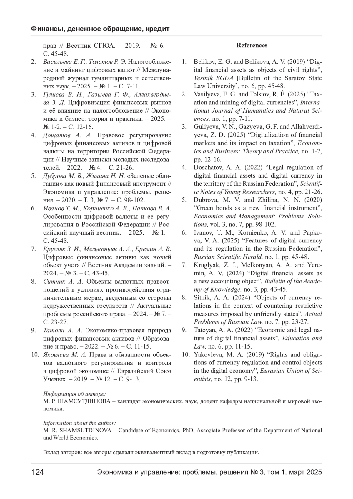 1. Беликов Е. Г., Беликова А. В. Цифровые финансовые активы как объект гражданских прав // Вестник СГЮА. - 2019. - № 6. - С. 45-48. EDN: KLYVCE