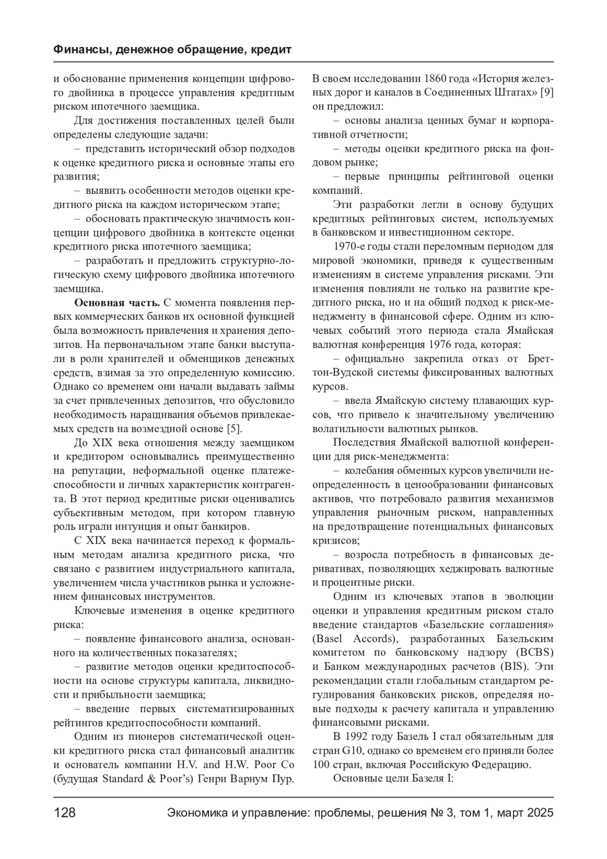 В условиях стремительного развития банковского сектора и изменений в технологической сфере финансового сектора, актуальность предмета исследования определяется необходимостью совершенствования существующих подходов к управлению кредитным риском с использованием современных технологий. В статье проанализированы основные этапы эволюции вопроса кредитного риска и ключевые события в сфере риск-менеджмента, оказавшие влияние на развитие теории вопроса, такие как: Ямайская валютная конференция 1976 года и введение стандартов «Базельские соглашения». Выявлена проблема потребности кредитных организаций в разработке инструментов, способных учесть особенности платежной дисциплины ипотечного заемщика, современные решения в области цифровых технологий и тренды развития методов оценки кредитного риска. Авторами рассмотрена структурно-логическая схема цифрового двойника ипотечного заемщика, позволяющая учесть потребность кредитных организаций в контекстуализации разнородных данных, составлении подробной аналитики текущего и ретро состояния, и прогнозировании будущего финансового поведения ипотечного заемщика. Можно предложить понятие гибридного виртуально-физического образа (паттерна) ипотечного кредитного портфеля, на основе структурно-логической схемы цифрового двойника ипотечного заемщика, позволяющего анализировать сценарии финансового поведения заемщиков, что развивает теорию кредитного риска.
