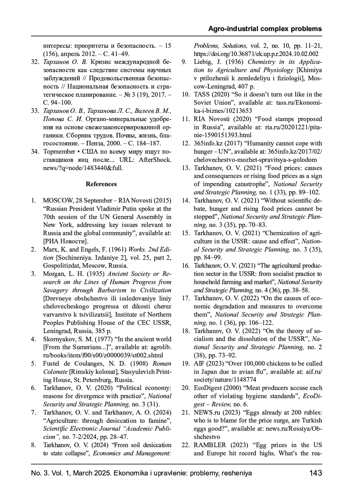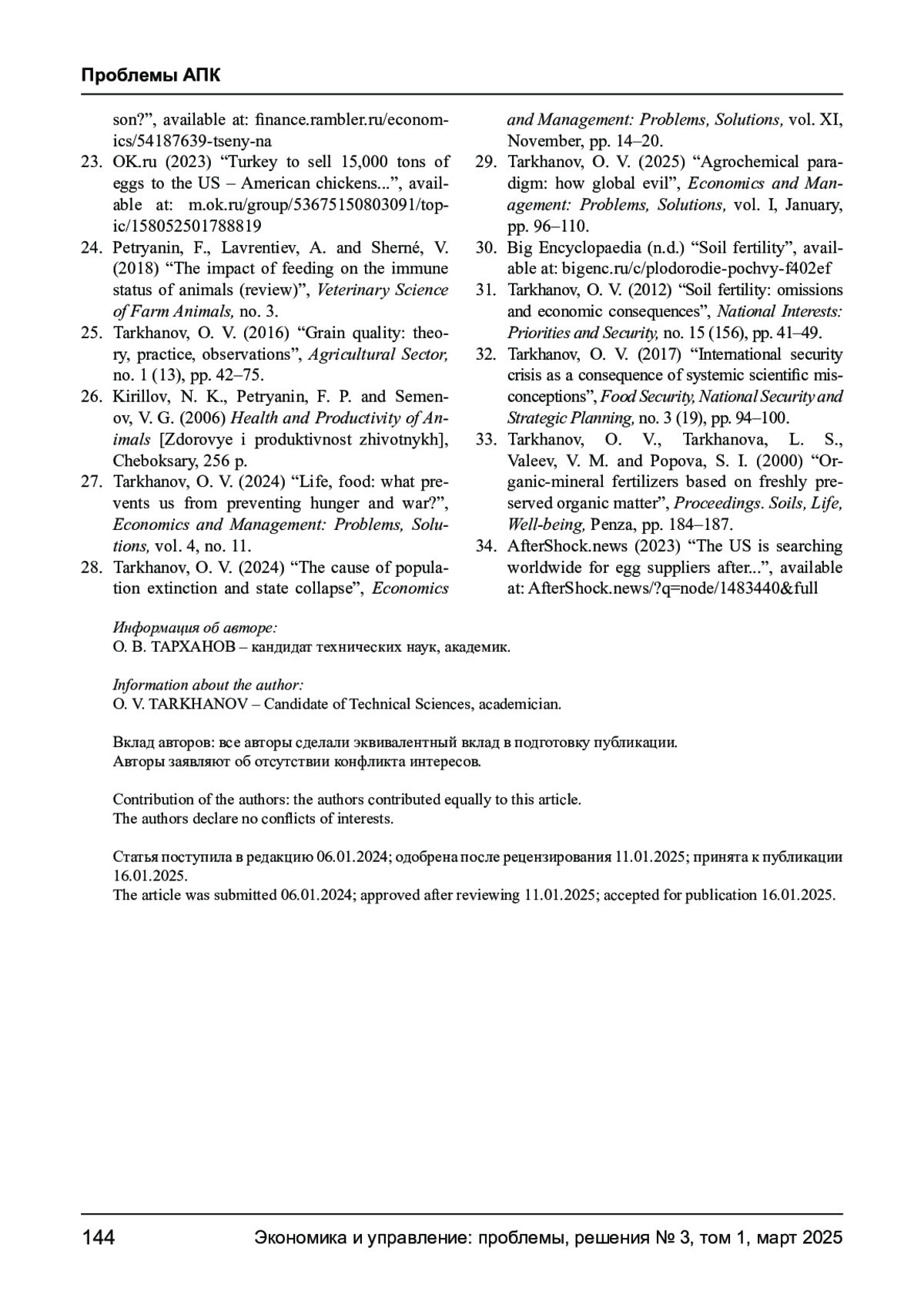 27. Тарханов О. В. Жизнь, пища: что мешает предотвратить голод и войну? // Экономика и управление: проблемы, решения. - 2024. - № 11, том 4. EDN: EDUANI