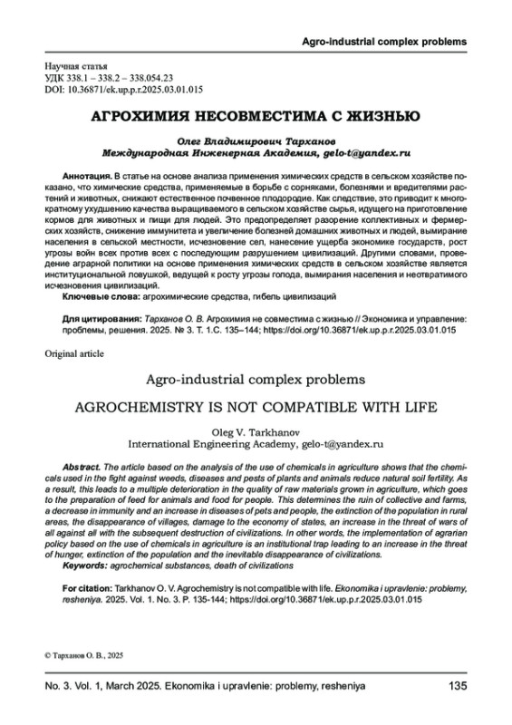 29. Тарханов О. В. Агрохимическая парадигма: как мировое зло // Экономика и управление: проблемы, решения. - Том I. - Январь 2025. - С. 96-110. EDN: OYFLCG