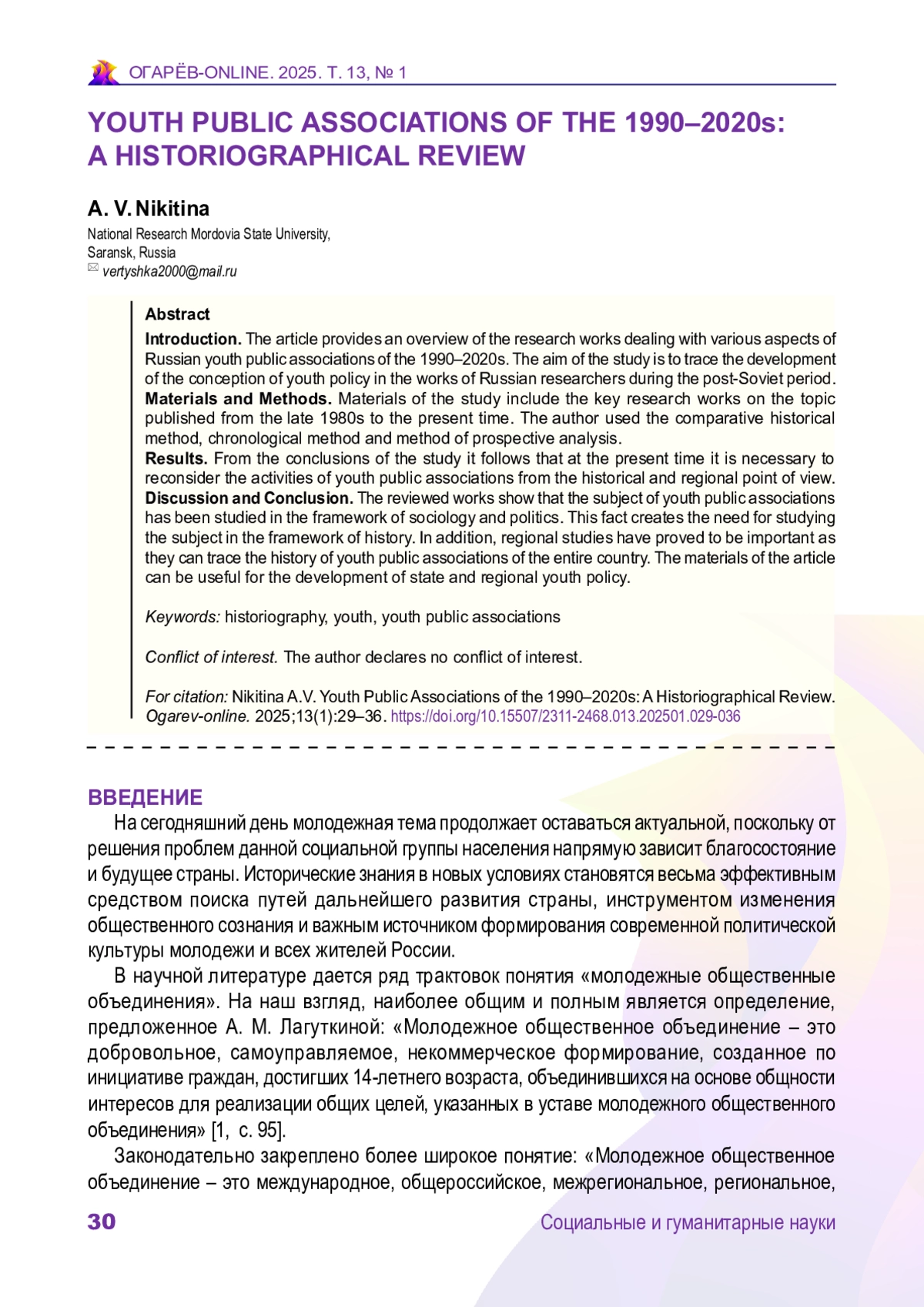 Введение. Статья посвящена обзору научных трудов, где рассматриваются различные аспекты российских молодежных общественных объединений 1990–2020-х гг. Цель исследования – проследить развитие концепции молодежной политики в исследованиях отечественных ученых в постсоветский период.