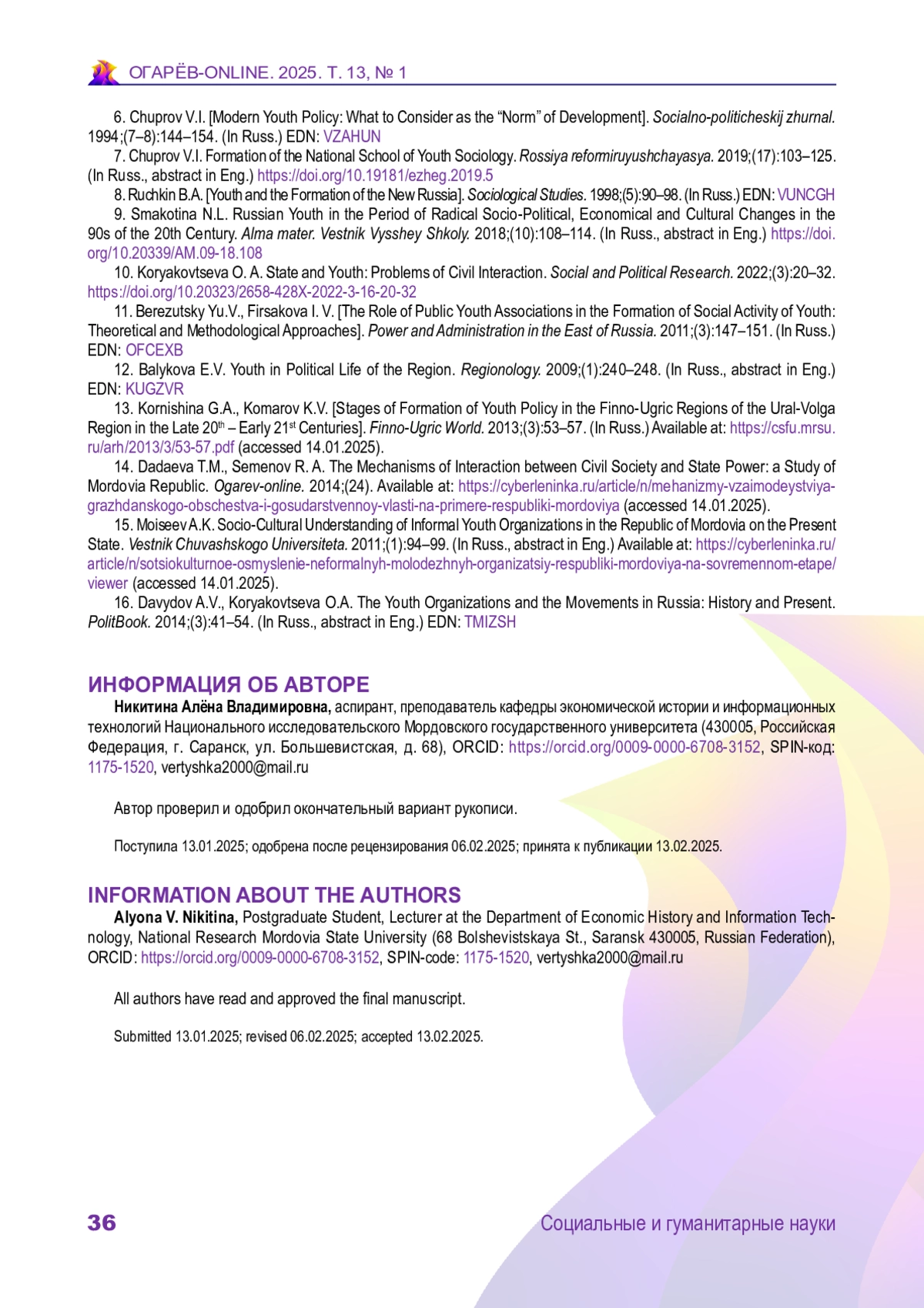 15. Моисеев А. К. Социокультурное осмысление неформальных молодежных организаций Республики Мордовия на современном этапе // Вестник Чувашского университета. 2011. № 1. С. 94-99. URL: https://cyberleninka.ru/article/n/sotsiokulturnoe-osmyslenie-neformalnyh-molodezhnyh-organizatsiy-respubliki-mordoviya-na-sovremennom-etape/viewer (дата обращения: 14.01.2025).