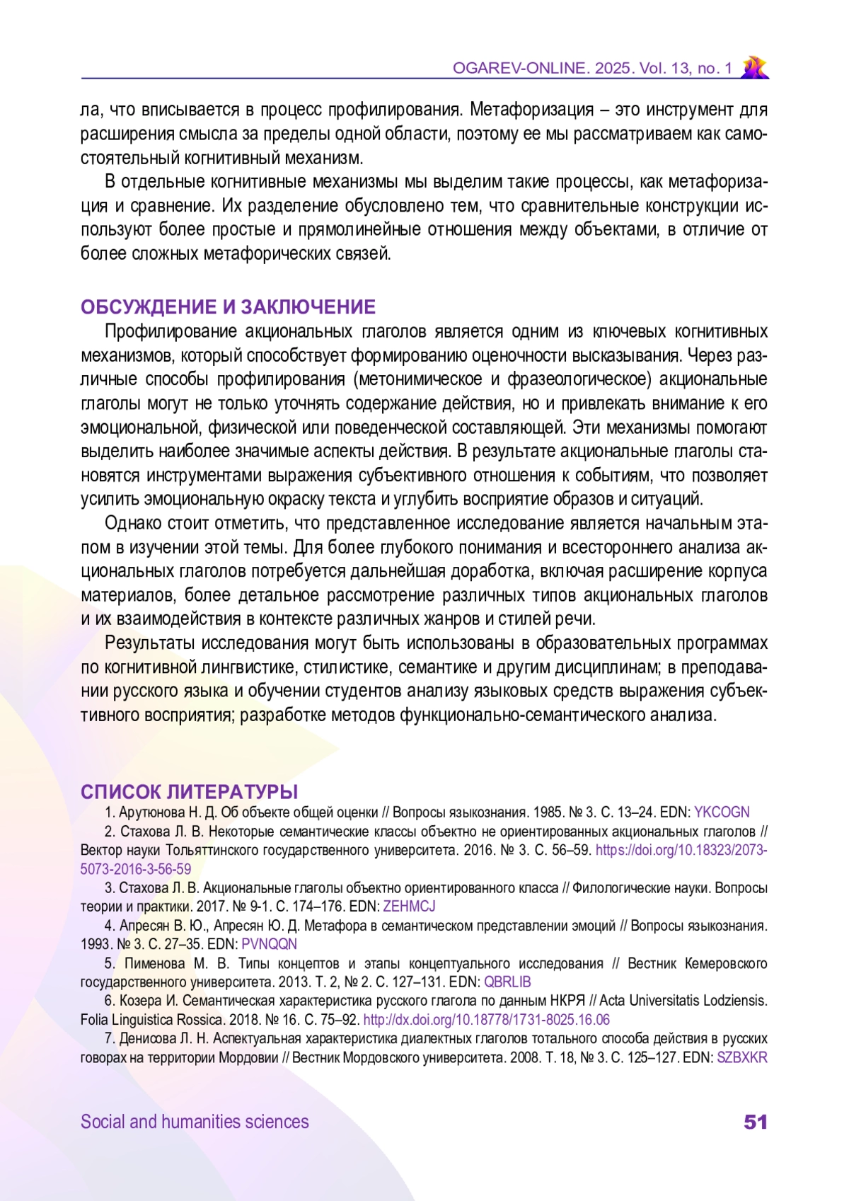 Обсуждение и заключение. Сделанные автором выводы вносят вклад в развитие когнитивной лингвистики. Перспективы дальнейших исследований связаны с углубленным изучением специфики взаимодействия акциональных глаголов с другими когнитивными механизмами в текстах разных жанров. Материалы статьи могут быть полезны в преподавании русского языка и разработке методов функционально-семантического анализа