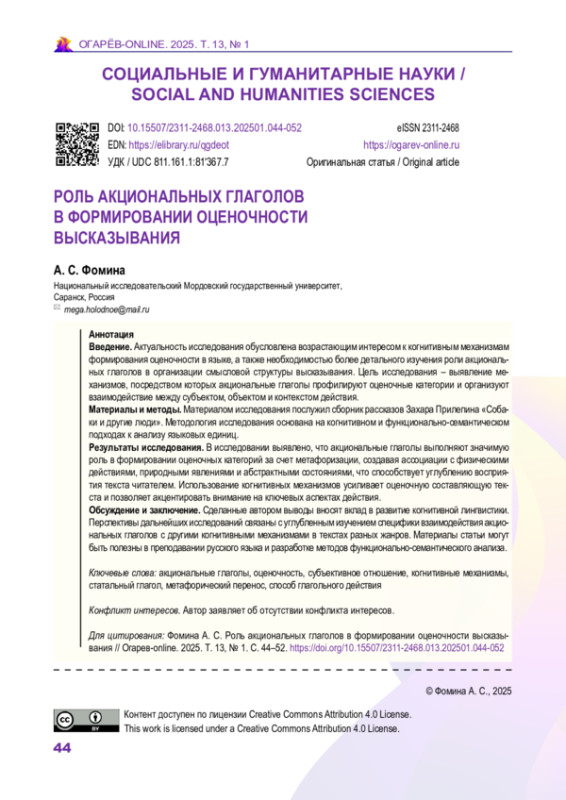 Введение. Актуальность исследования обусловлена возрастающим интересом к когнитивным механизмам формирования оценочности в языке, а также необходимостью более детального изучения роли акциональных глаголов в организации смысловой структуры высказывания. Цель исследования – выявление механизмов, посредством которых акциональные глаголы профилируют оценочные категории и организуют взаимодействие между субъектом, объектом и контекстом действия.