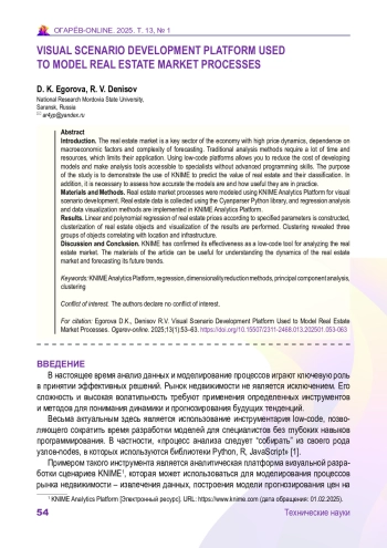 Введение. Рынок недвижимости – ключевой сектор экономики с высокой динамикой цен, зависимостью от макроэкономических факторов и сложностью прогнозирования. Традиционные методы анализа требуют много времени и ресурсов, что ограничивает их применение. Использование low-code платформ позволяет сократить затраты на разработку моделей и сделать инструменты анализа доступными для специалистов без углубленных навыков программирования. Цель исследования – продемонстрировать использование KNIME для прогнозирования стоимости объектов недвижимости и их классификации; оценить, насколько точны модели и насколько они полезны на практике.