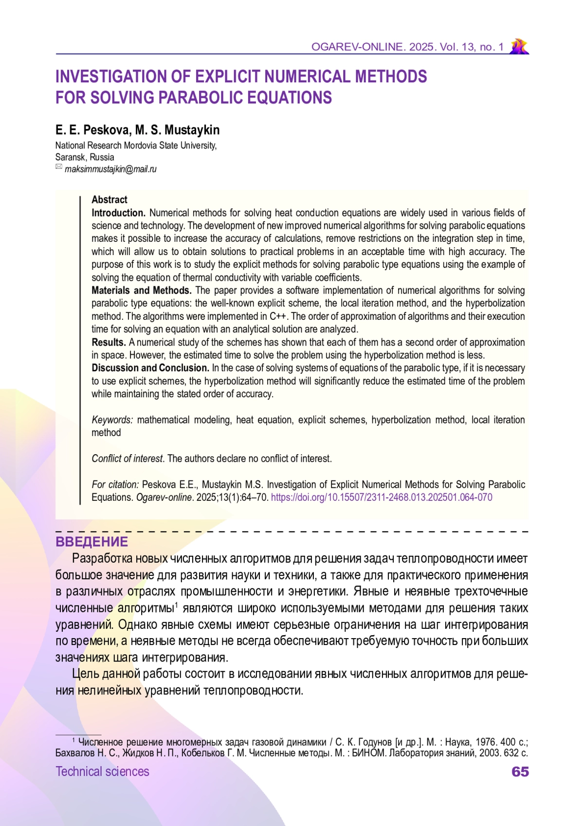 3. Четверушкин Б. Н., Ольховская О. Г., Гасилов В. А. О стабилизации явной схемы решения нелинейного уравнения параболического типа // Доклады Российской академии наук. Математика, информатика, процессы управления. 2022. T. 506, № 1. С. 30-36. DOI: 10.31857/S268695432205006X