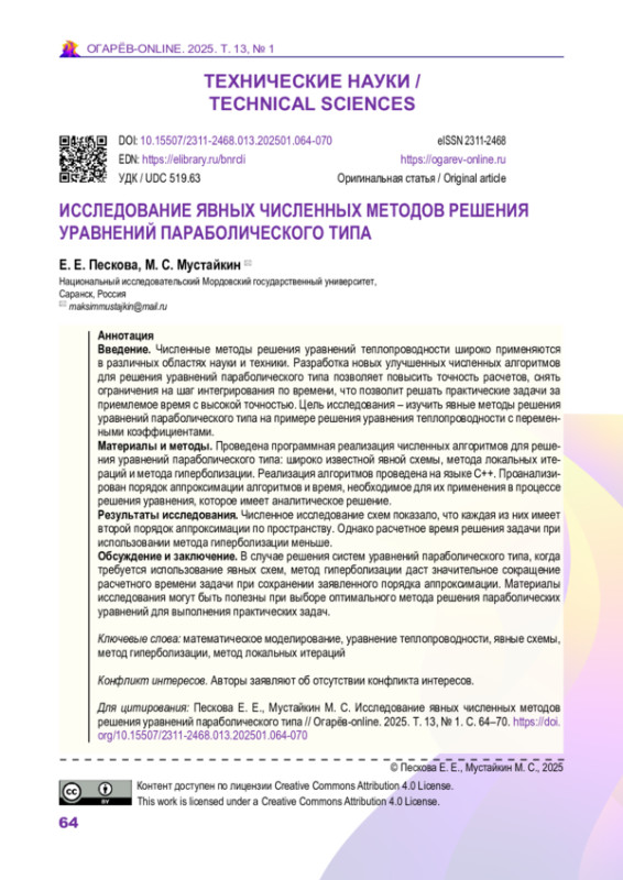 Введение. Численные методы решения уравнений теплопроводности широко применяются в различных областях науки и техники. Разработка новых улучшенных численных алгоритмов для решения уравнений параболического типа позволяет повысить точность расчетов, снять ограничения на шаг интегрирования по времени, что позволит решать практические задачи за приемлемое время с высокой точностью. Цель исследования – изучить явные методы решения уравнений параболического типа на примере решения уравнения теплопроводности с переменными коэффициентами.