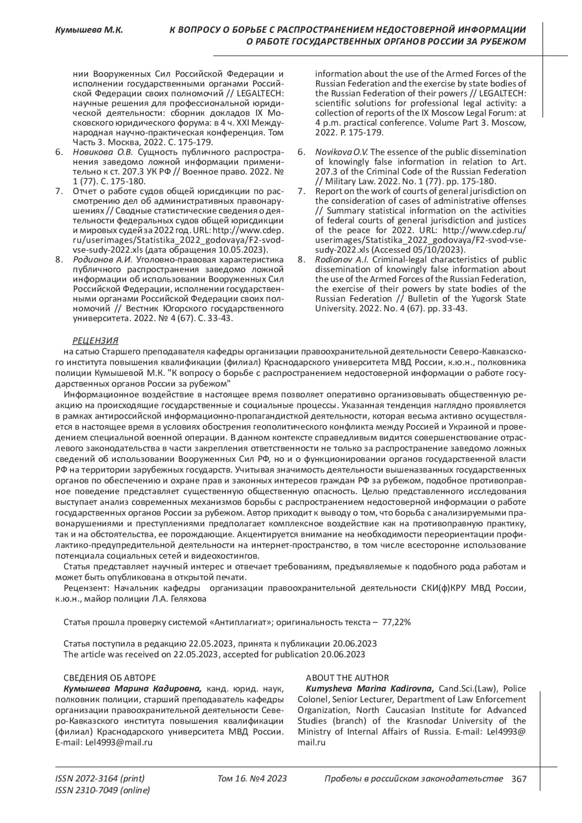5. Мурадян С.В. Вопросы применения ст. 207.3 УК РФ, предусматривающей ответственность за распространение ложных сведений об использовании Вооруженных Сил Российской Федерации и исполнении государственными органами Российской Федерации своих полномочий // LEGALTECH: научные решения для профессиональной юридической деятельности: сборник докладов IX Московского юридического форума: в 4 ч. XXI Международная научно-практическая конференция. Том Часть 3. Москва, 2022. С. 175-179. EDN: DCCBCA