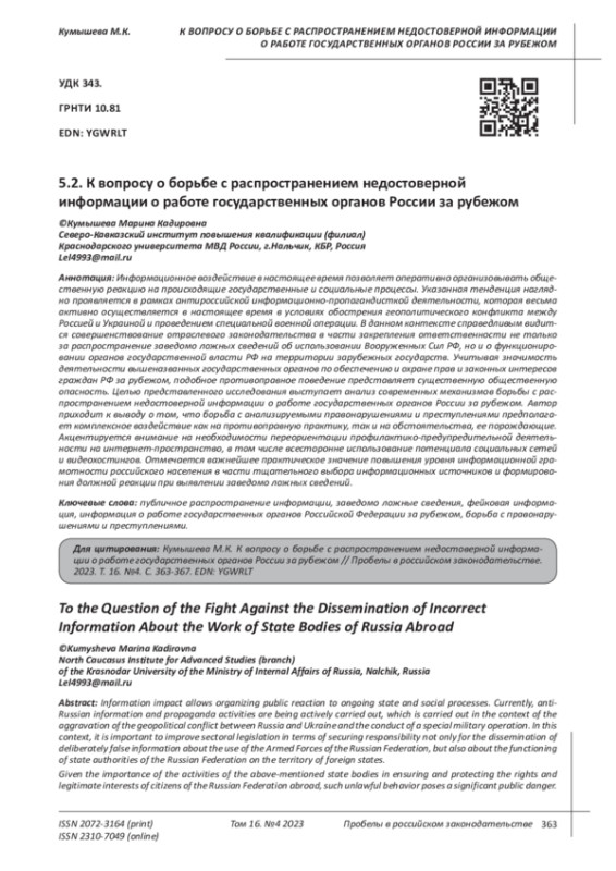 Информационное воздействие в настоящее время позволяет оперативно организовывать общественную реакцию на происходящие государственные и социальные процессы. Указанная тенденция наглядно проявляется в рамках антироссийской информационно-пропагандисткой деятельности, которая весьма активно осуществляется в настоящее время в условиях обострения геополитического конфликта между Россией и Украиной и проведением специальной военной операции. В данном контексте справедливым видится совершенствование отраслевого законодательства в части закрепления ответственности не только за распространение заведомо ложных сведений об использовании Вооруженных Сил РФ, но и о функционировании органов государственной власти РФ на территории зарубежных государств. Учитывая значимость деятельности вышеназванных государственных органов по обеспечению и охране прав и законных интересов граждан РФ за рубежом, подобное противоправное поведение представляет существенную общественную опасность. Целью представленного исследования выступает анализ современных механизмов борьбы с распространением недостоверной информации о работе государственных органов России за рубежом. Автор приходит к выводу о том, что борьба с анализируемыми правонарушениями и преступлениями предполагает комплексное воздействие как на противоправную практику, так и на обстоятельства, ее порождающие. Акцентируется внимание на необходимости переориентации профилактико-предупредительной деятельности на интернет-пространство, в том числе всесторонне использование потенциала социальных сетей и видеохостингов. Отмечается важнейшее практическое значение повышения уровня информационной грамотности российского населения в части тщательного выбора информационных источников и формирования должной реакции при выявлении заведомо ложных сведений.
