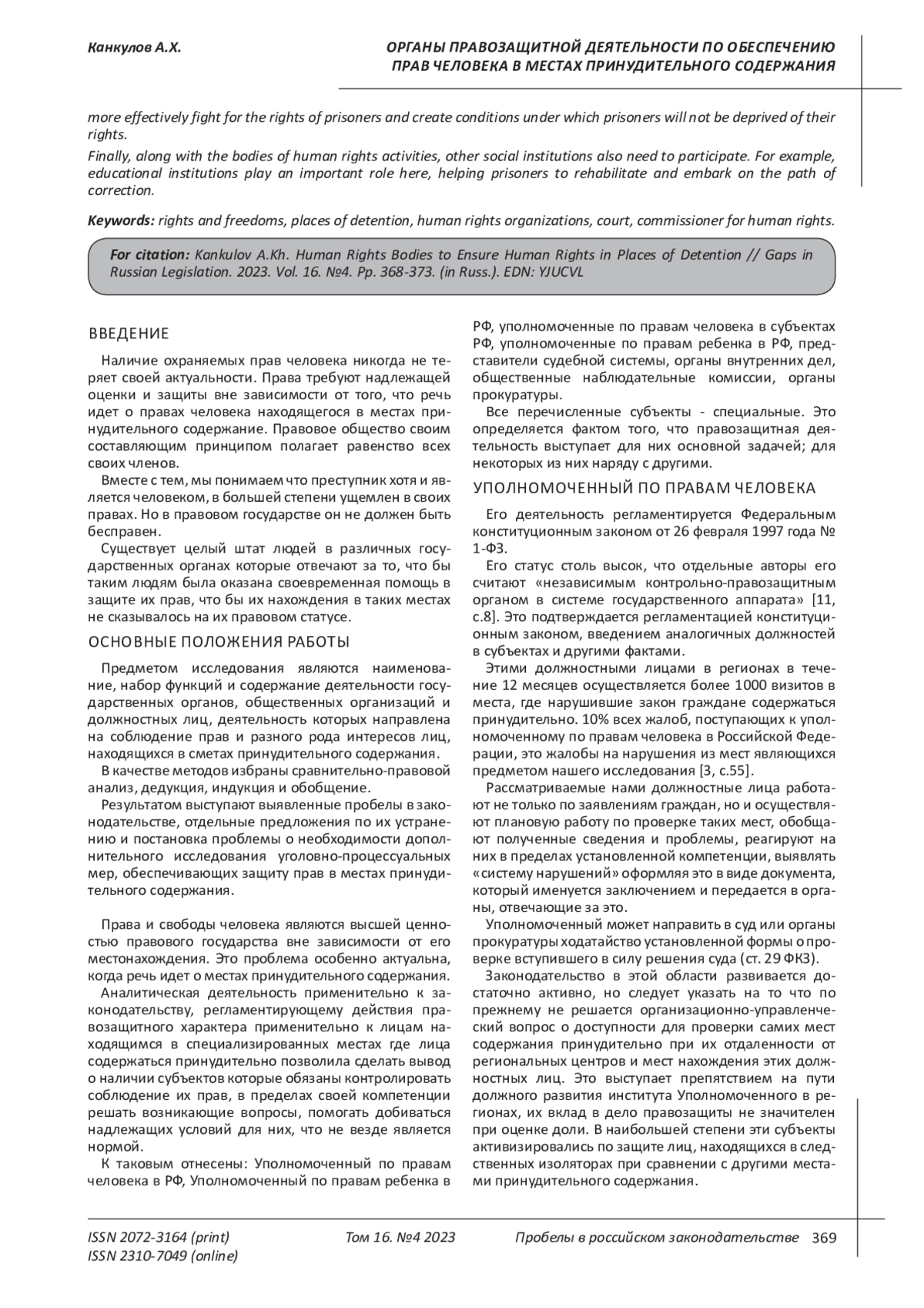 Moskalkova T.M. Institute of Commissioners for Human Rights in the State Mechanism of Russia // Administrative Law and Process. - 2018. - No. 12. P. 55.