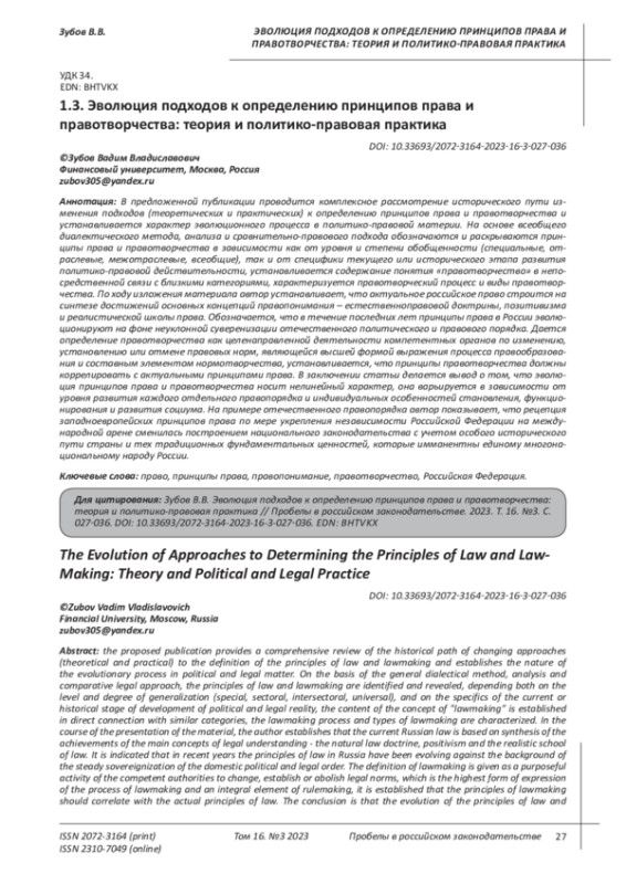 Статья: ЭВОЛЮЦИЯ ПОДХОДОВ К ОПРЕДЕЛЕНИЮ ПРИНЦИПОВ ПРАВА И ПРАВОТВОРЧЕСТВА: ТЕОРИЯ И ПОЛИТИКО-ПРАВОВАЯ ПРАКТИКА (2023)