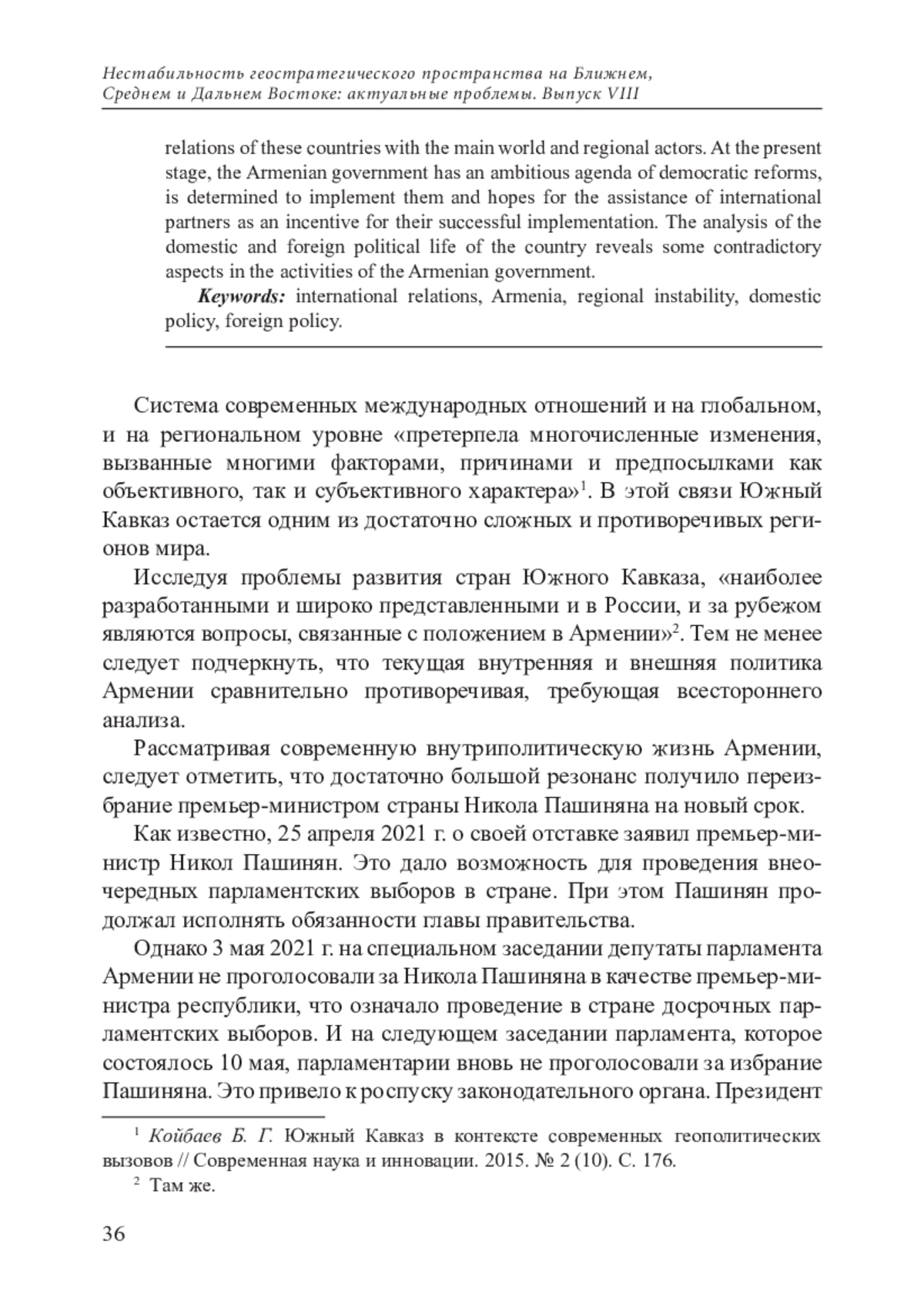 2. Койбаев Б. Г. Некоторые тенденции в политике государств Южного Кавказа в условиях региональной нестабильности. // Нестабильность геостратегического пространства на Ближнем, Среднем и Дальнем Востоке актуальные проблемы. Ежегодник 2020 / Отв. ред. М. И. Крупянко; Институт востоковедения РАН. - М.: ИВ РАН, 2020.