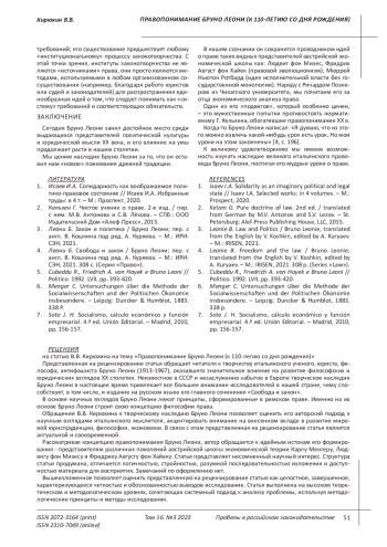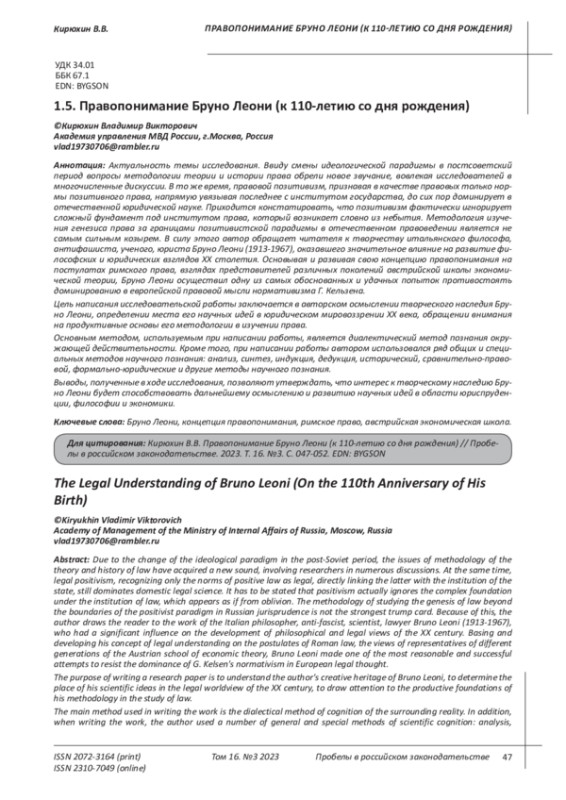 Актуальность темы исследования. Ввиду смены идеологической парадигмы в постсоветский период вопросы методологии теории и истории права обрели новое звучание, вовлекая исследователей в многочисленные дискуссии. В то же время, правовой позитивизм, признавая в качестве правовых только нормы позитивного права, напрямую увязывая последнее с институтом государства, до сих пор доминирует в отечественной юридической науке. Приходится констатировать, что позитивизм фактически игнорирует сложный фундамент под институтом права, который возникает словно из небытия. Методология изучения генезиса права за границами позитивистской парадигмы в отечественном правоведении является не самым сильным козырем. В силу этого автор обращает читателя к творчеству итальянского философа, антифашиста, ученого, юриста Бруно Леони (1913-1967), оказавшего значительное влияние на развитие философских и юридических взглядов XX столетия. Основывая и развивая свою концепцию правопонимания на постулатах римского права, взглядах представителей различных поколений австрийской школы экономической теории, Бруно Леони осуществил одну из самых обоснованных и удачных попыток противостоять доминированию в европейской правовой мысли нормативизма Г. Кельзена. Цель написания исследовательской работы заключается в авторском осмыслении творческого наследия Бруно Леони, определении места его научных идей в юридическом мировоззрении XX века, обращении внимания на продуктивные основы его методологии в изучении права. Основным методом, используемым при написании работы, является диалектический метод познания окружающей действительности. Кроме того, при написании работы автором использовался ряд общих и специальных методов научного познания: анализ, синтез, индукция, дедукция, исторический, сравнительно-правовой, формально-юридические и другие методы научного познания. Выводы, полученные в ходе исследования, позволяют утверждать, что интерес к творческому наследию Бруно Леони будет способствовать дальнейшему осмыслению и развитию научных идей в области юриспруденции, философии и экономики.