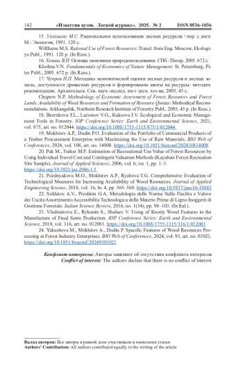 24. Yakusheva M., Mokhirev A., Dudin P. Specific Features of Wood Resources Processing at Forest Industry Enterprises. BIO Web of Conferences, 2024, vol. 93, art. no. 01021. DOI: 10.1051/bioconf/20249301021 EDN: SKPSIG