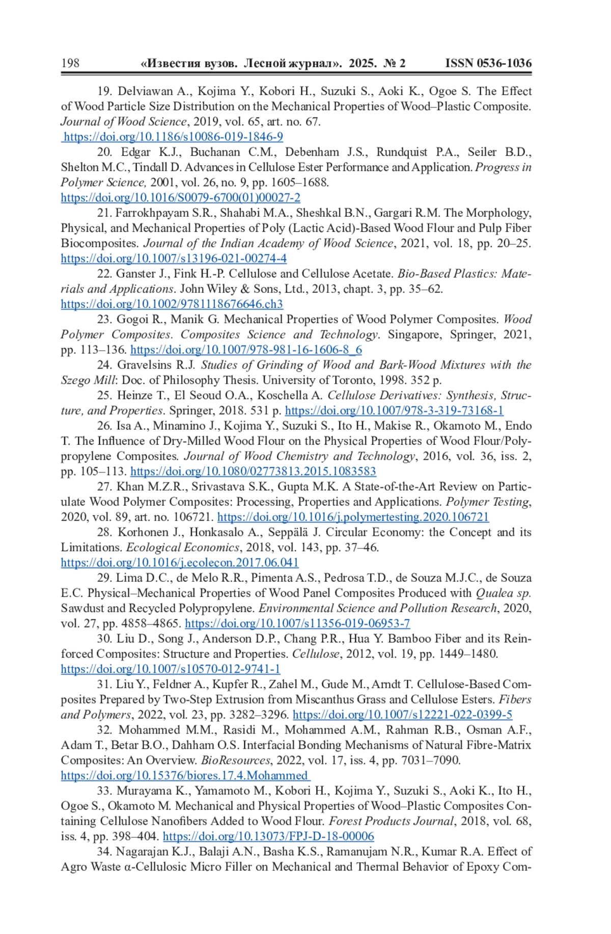31. Liu Y., Feldner A., Kupfer R., Zahel M., Gude M., Arndt T. Cellulose-Based Composites Prepared by Two-Step Extrusion from Miscanthus Grass and Cellulose Esters. Fibers and Polymers, 2022, vol. 23, pp. 3282-3296. DOI: 10.1007/s12221-022-0399-5 EDN: SRVEXU