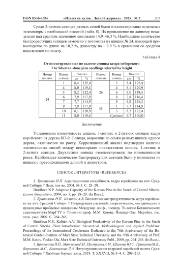 1. Братилова Н.П. Адаптационная способность кедра корейского на юге Средней Сибири // Лесн. хоз-во. 2004. No 5. С. 28-29.